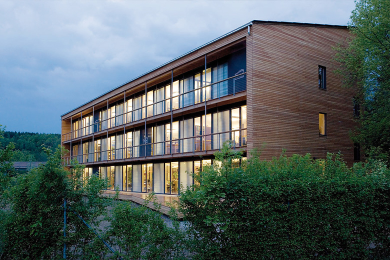 Das Bürogebäude für die zentrale Verwaltung der weltweit tätigen Firma beherbergt rund 50 Arbeitsplätze. Die Grundrisse sind linear aufgebaut, zwei Treppenhäuser aus Beton für die Fluchtwege, der Rest besteht aus vorfabrizierten Holzelementen. Konstruktiv ist der einfache Holzskelettbau aufs Wesentliche reduziert. Die Stimmung in den Grossraumbüros ist locker und entspricht den Restaurants. Dank des passiv-solaren Architekturkonzeptes konnten die technischen Anlagen minimiert werden. Der klimatische Komfort für die Mitarbeiterinnen und Mitarbeiter ist in allen Jahreszeiten sehr hoch und der Energieverbrauch liegt mehrfach tiefer als bei einem konventionellen Gebäude.