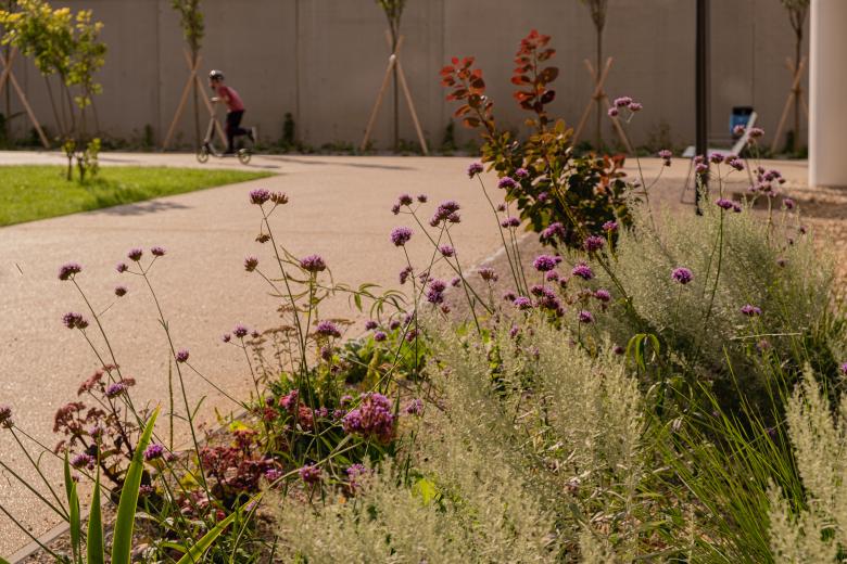 Das Bepflanzungskonzept zeigt mit großen und kleinen Bäumen sowie mit trockenresistenten Gräserstreifen, Stauden und Heckenelementen in Verbindung mit zeitgemäßen Ausstattungslinien für Möblierung und Beleuchtung eine durchdachte und ökologische Freiraumnutzung. Eine hohe Aufenthaltsqualität für Kinder und Jugendliche, aber auch für Erwachsene wird durch ein entsprechendes Angebot für Sitzen, Liegen und Spielen geschaffen.