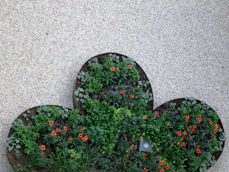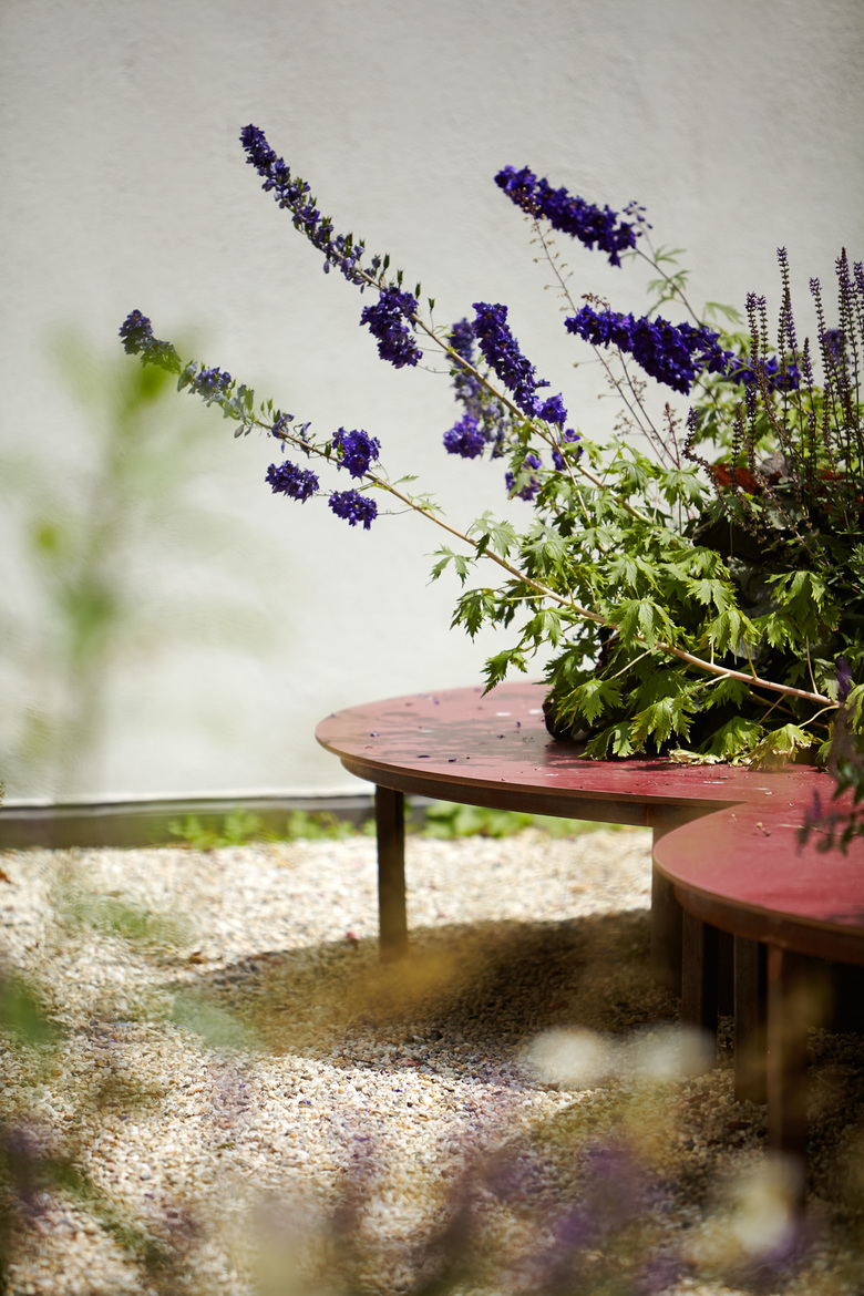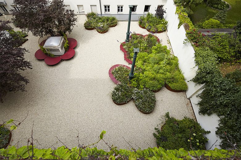 Die Blumenelemente sind aus gebogenem Corten-Stahl. Verschiedene Höhen schaffen ein Höhenprofil und differenzieren die Blumenbeete nach Farben und Jahreszeiten. Ihr Grün ist farbiger Gegenpol zum rostroten Corten-Stahl und den weinroten Sitzflächen. Der überalterte Gehölzbestand wurde entfernt, die bleibenden Blutpflaumen kommen nun zur Geltung, die 1.500 neuen Stauden, Gräser und Kleingehölze beleben den Innenhof mit ihren Blüh- und Duftaspekten wie Narzissen, Lilien, Salbei, Kamille, Echinacea in den Farbmischungen von weiß-orange-lila. Insgesamt wurden 50 verschiedene Arten gepflanzt, die auch die ökologische Vielfalt erhöhen und Tiere wie Schmetterlinge und Bienen anziehen. Sitzflächen aus weinroten Max Exterior Platten säumen die Blumenornamente ein, fassen auch die Bestandsbäume und ermöglichen ein Sitzen unter Bäumen, sodass MitarbeiterInnen in den Pausen sowohl Schatten als auch Sonne genießen können.