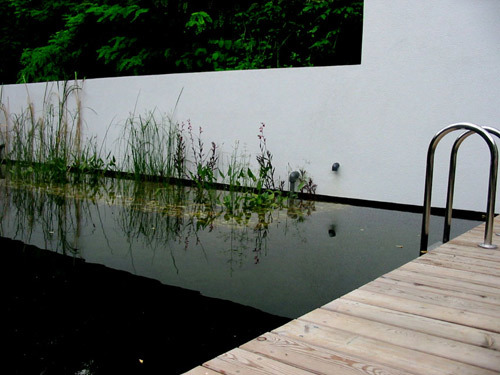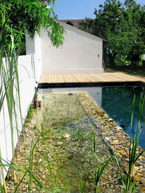 Die burgenländische-kroatische Gemeinde Draßburg ist eine Hangsiedlung und liegt zentral in einem lang gestreckten Hotter, der vom Rohrbacher Kogel über den Draßburger Wald bis in die Vulkanniederung vorstößt. Am Übergang zu dieser freien Natur und zum Wald entstand eine Neugestaltung des Gartens eines Wochenendehauses. Ergänzt wurde der Garten 3 Jahre später mit einem Schwimmteich: Trotz der ökologischen Funktion und Selbstreinigungskraft entspricht er der Ästhetik eines Pools. Die Schwimmzone von 9 Meter Länge und 3,50 Meter wird vom "Sumpf" der Pflanzzone mit Seerosen und Gräsern durch eine Unterwasserwand mit Steinkörben getrennt. Die Wassertiefe verläuft von 1,20 bis 2,20 Meter - im seichten Teil kann man in der "Wasserlounge" sitzen und das warme pannonische Klima genießen. Das Wasserbecken setzt einen bewussten Kontrapunkt zur Natürlichkeit der Umgebung; über die strenge Gartenmauer hängen die Zweige der Robinie am Beckenrand und spiegeln sich an der Wasseroberfläche. Eine Einfassung des Teiches aus Holzlattenrost rundet das Ambiente ab.