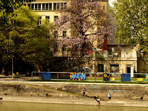 Der Donaukanal als städtischer Freiraum im Zentrum von Wien hat einen begleitenden weitgehend ungenutzen Grünstreifen. Die StreetworkerInnen wandten sich mit ihren Anliegen an die Baudirektion Wien. Unser Planungsteam hatte die Aufgabe mit Jugendlichen einen Partizipationsprozess durchzuführen. In einem Planungsworkshop wurde der Jugendfreiraum als solcher  definiert und passende Ausstattungselemente zum Sitzen, Liegen, Plaudern, Beobachten, Treffen, Bewegen entworfen. Die Liege-Sitzplattform aus Lärchenholz unter dem Altbestand großer Laubbäume hat Lehnen aus Compactfoamingplatten und dient zum Relaxen. Der Zaun mit beidseitigen Sitzelementen trägt mehrere Funktionen: Jene Sitzelemente zur Grünfläche sind zum Zuschauen und für Rückzugsmöglichkeit und jene Sitzelemente zum Donaukanal sind für das Beobachten und Sonnen. Die Sitz- und Zaunelemente sind aus einem Stahlrahmen mit Kompaktplatten. Die Platten sind Flächen für Graffiti Bemalungen, die bereits in den ersten Wochen künstlerisch gestaltet wurden. Die Rasenfläche hat die Größe eines Volleyballfeldes - ein Volleyballnetz kann optional aufgestellt werden.