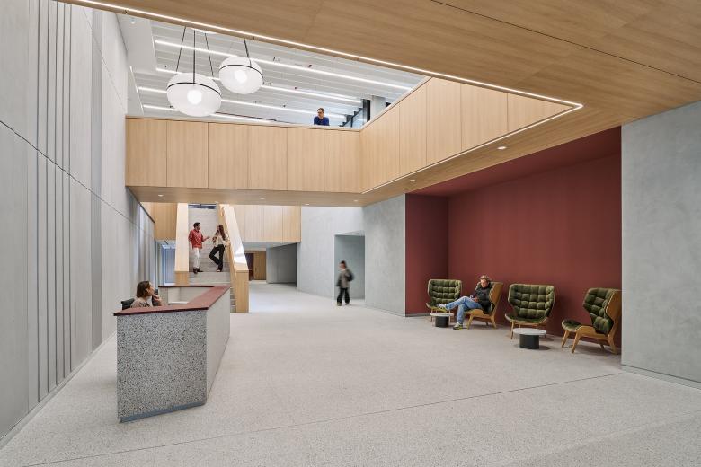 Für die Gemeinschaftsflächen setzt Kinzo auf Materialien, die mehr sagen als tausend Moodboards: Terrazzo, Holz, strukturierter Sichtbeton, dazu weinrote Akzente, die sich unaufdringlich in Szene setzen. Die Räume bleiben neutral genug für jede Branche, aber charaktervoll genug, um nicht in den „Corporate Beige“-Topf zu fallen.