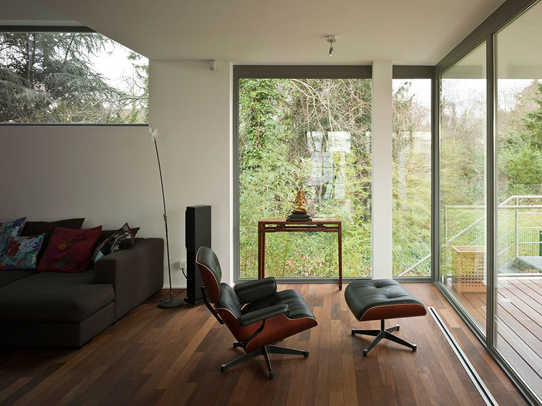 Es entstehen ein Eingangshof und ein Gartenzimmer vor der Elternschlafebene im Souterrain.Die Verschiebung generiert nicht nur eine neue und eigenwillige Plastizität, sondern kann eine großzügige Wohnebene mit einer überdachten Terrasse schaffen. Der Vorratsraum der Küche und die Bibliothek überkragen den tiefer gelegten Eingangshof und gewährleisten einen überdachten Zugangshof.