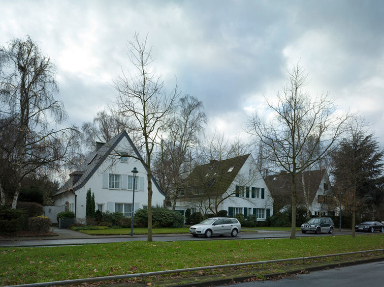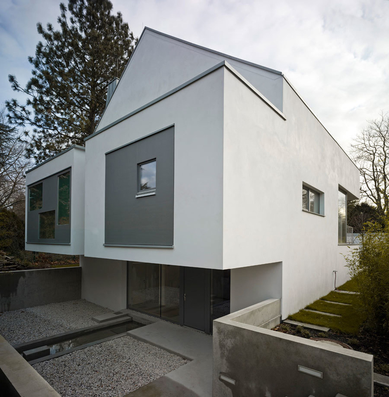 Der Stadtteil Stockum in Düsseldorf unterliegt einer Gestaltungssatzung, die einen weißen Baukörper mit Satteldach und einer Firsthöhe von 10 Metern vorschreibt. Ein archetypisches Haus. Der Entwurf transformiert mittels einer horizontalen Verschiebung der Geschossebenen dieses Bild. Gleichzeitig wird der Baukörper in die Topographie eingesenkt.