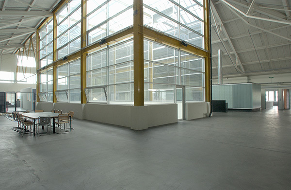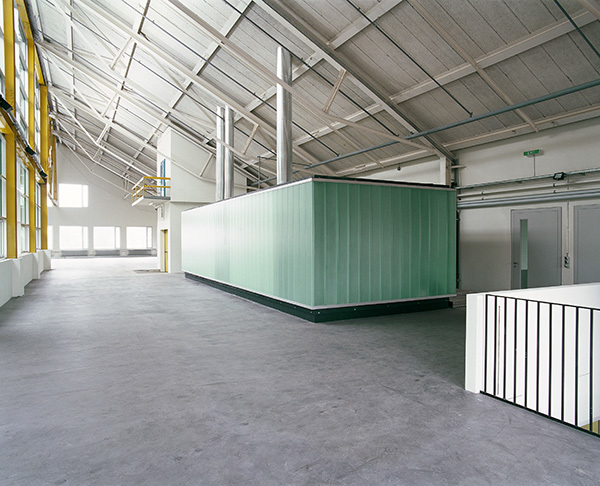 Neben der Verglasung des bestehenden Innenhofes wird eine Gussglas verkleidete Technik-Box in den Grossraum gestellt. Der konzentrierte Eingriff erhält den bestehenden Raum in seiner Wirkung und gleichzeitig strukturiert und zoniert er diesen. Der verglaste Innenhof ermöglicht trotz der grossen Raumtiefen eine gute Belichtung der Arbeitsplätze mit Tageslicht. Bestehende Reminiszenzen wie der grosse gemauerte Kamin und der bestehende Lift werden im Projekt integriert und tragen zur Erhaltung des industriellen Charakters bei.