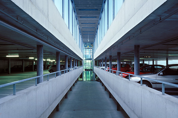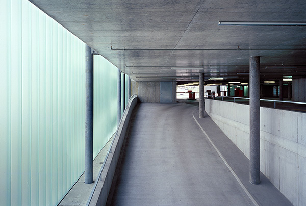 Der zweigeschossige unterirdische Teil des Parkhauses kann durch den zentralen, in Längsrichtung angeordneten Licht- und Erschliessungsschlitz zu einem grossen Teil auf natürliche Weise belichtet und belüftet werden. Das offene Gleisgeschoss übernimmt das Niveau der heute bestehenden Parkierungsebene und wird durch den Kopfbau gegen den Bahnhofplatz abgeschlossen. Die sich darauf befindenden 157 Parkplätze dienen dem Park+Ride der SBB. Um auch in Zukunft den Verlad von Gütern auf die Bahn gewährleisten zu können, ist dieses Geschoss mit einer Verladerampe und einem Dienstgebäude für die SBB ausgerüstet.
