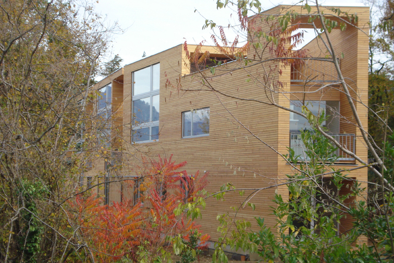 L’edificio è costituito da una costruzione prefabbricata in legno intelaiato, appoggiata su uno zoccolo in cemento armato che contiene l’autorimessa. Il rivestimento è di listelli orizzontali in douglasie grezze.