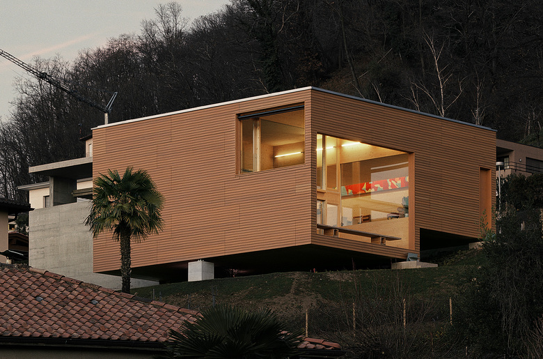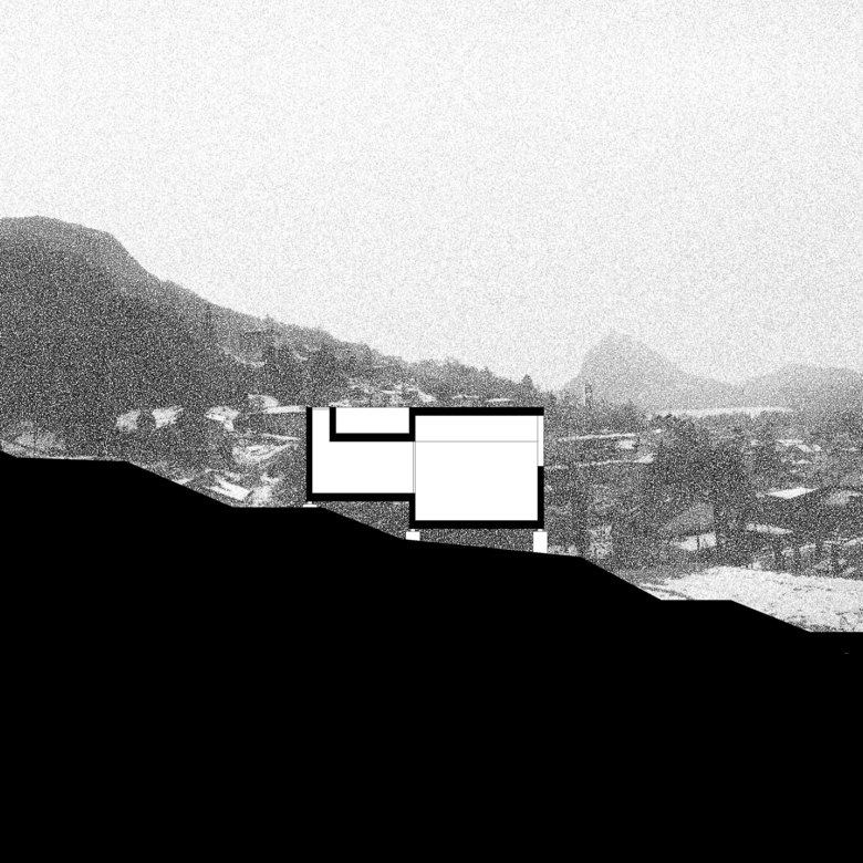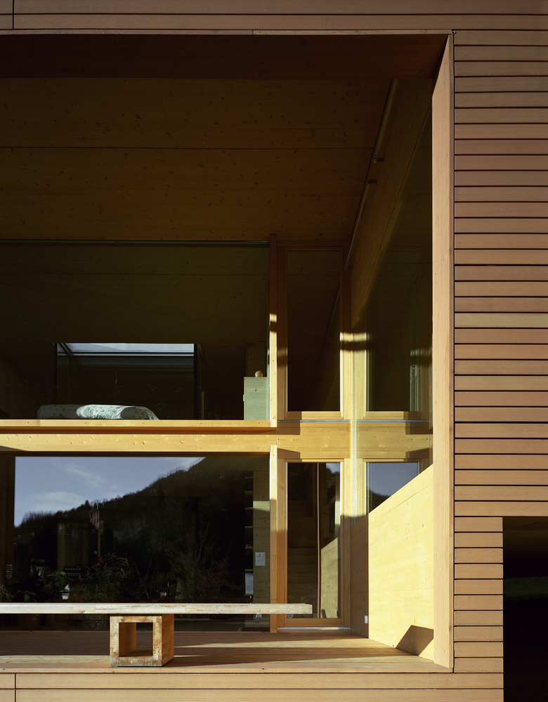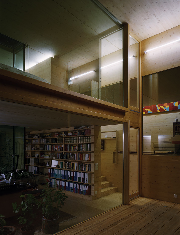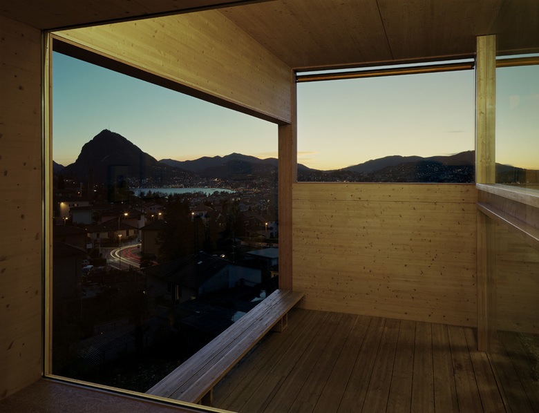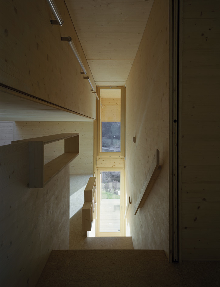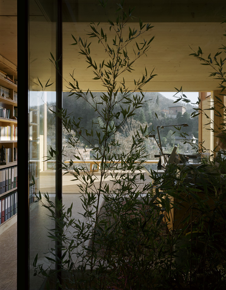 Dentro il volume della casa un paesaggio composto da terrazze interne che rispondono all’andamento del pendio e alla vista forma uno spazio continuo intorno alla grande terrazza. La luce entra attraverso corpi di varie dimensioni incavati nel volume: la grande terrazza, una piccola corte che funge da parete divisoria nella zona notte e un lucernario che corre lungo tutta la zona giorno. La corte presenta un microclima simile a quello di una serra e consente di penetrare l’edificio con piante. Il lucernario lungo il soggiorno svolge anche la funzione di captare il calore, garantendo un basso consumo energetico.
