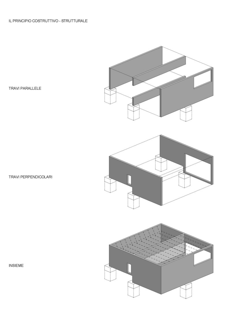 L’elemento di raccordo con il terreno è il posteggio, il cui zoccolo contiene i locali tecnici. Si accede alla casa tramite un piccolo ponte, che si stacca dalla terra e conduce ad un mondo tutto interno, proiettato verso l’orizzonte.