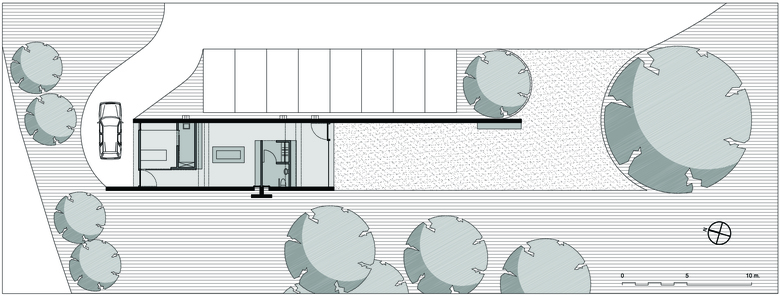 Il nuovo obitorio è costituito da due muri paralleli che si inseriscono tra il parco e il posteggio dell'Ospedale psichiatrico, definendo una fascia intermedia tra le due entità.