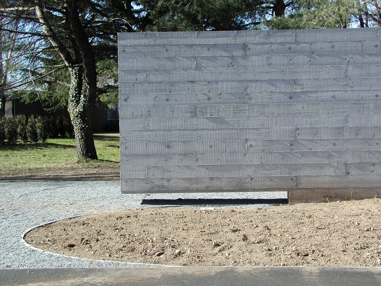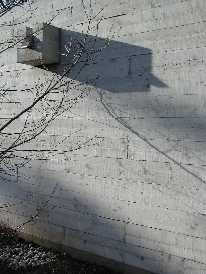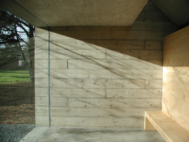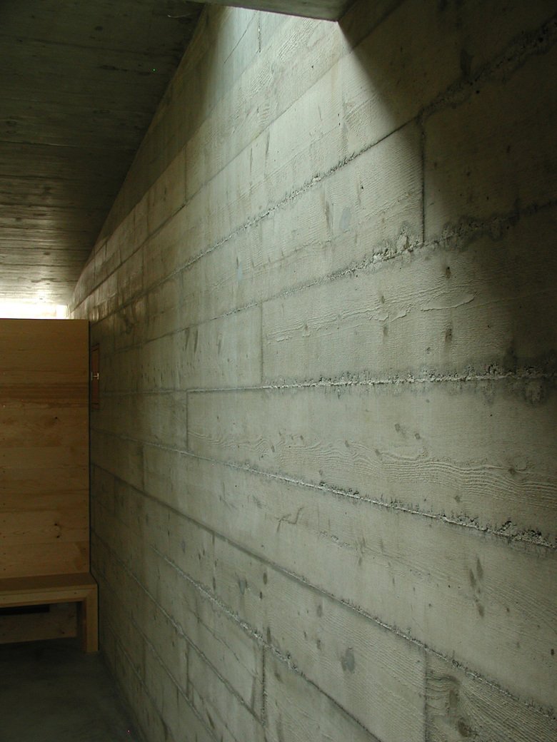 I muri in cemento armato vengono casserati con assi di legno di 24 cm di altezza, 4 m di lunghezza, non piallate, che richiamano quelle utilizzate per la costruzione dei corpi interni e assegnano all'edificio un ordine orizzontale in contrapposizione alla verticalità degli alberi circostanti.