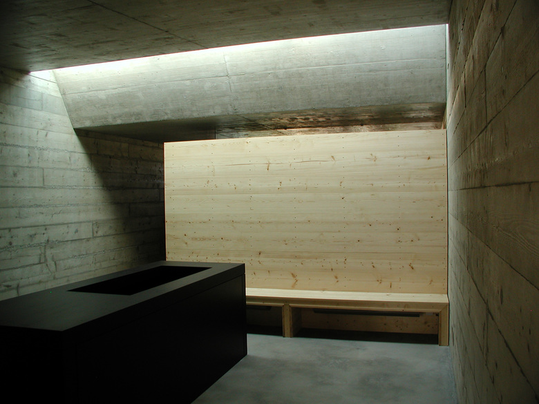 Il beton brut -à peau d'éléphant- conferisce plasticità e massa al padiglione, trasformandone la parte centrale -la camera mortuaria- in un mondo assestante, sacrale.