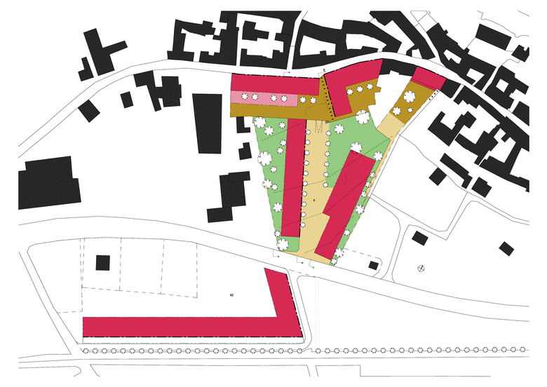 Tra via Giulia e strada cantonale si propone un’edificazione in senso trasversale, così che anche gli spazi verdi siano trasversali su tutta la profondità, permettendo in questo modo una lettura delle strutture vecchie (nucleo) e nuove.