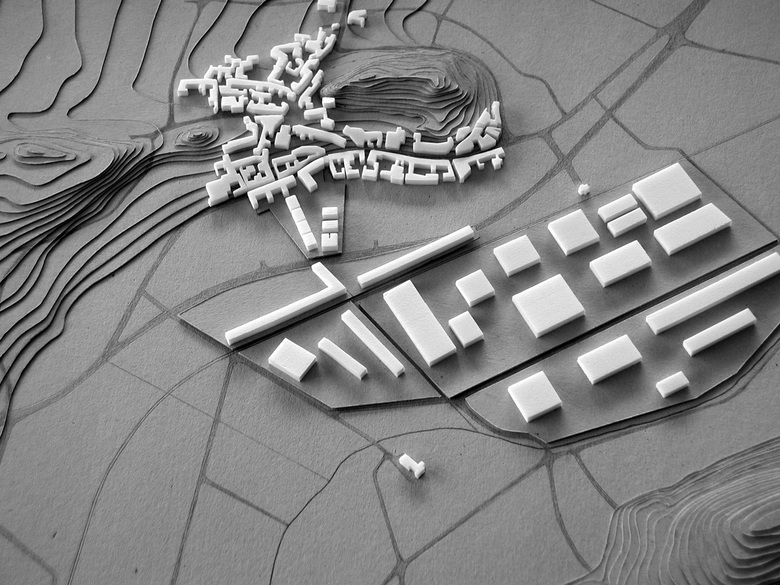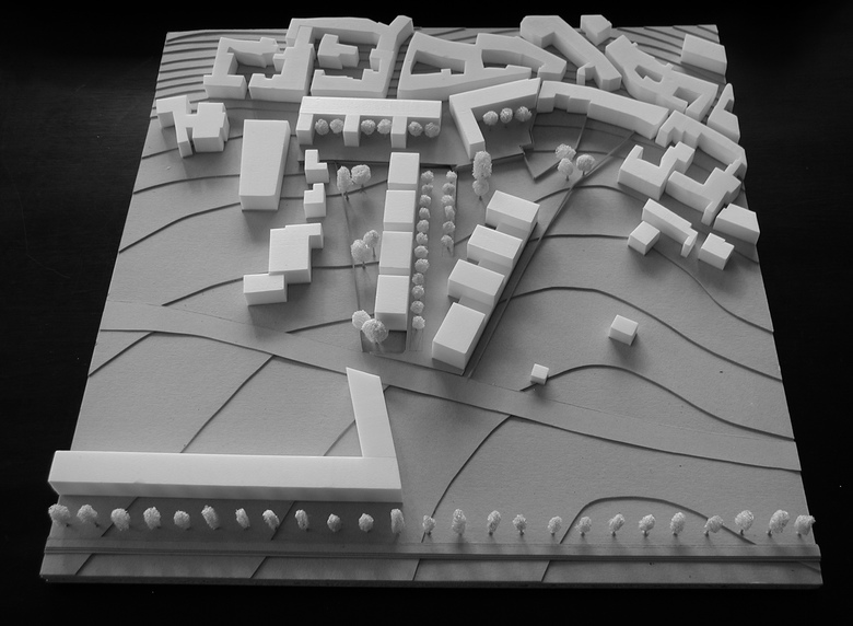 Il progetto tiene conto del preciso inserimento della linea ferroviaria creando un limite verso l’area industriale. Per lo spazio tra l’edificazione lungo il tracciato ferroviario ed il nucleo di Stabio si propone un’organizzazione spaziale trasversale.
