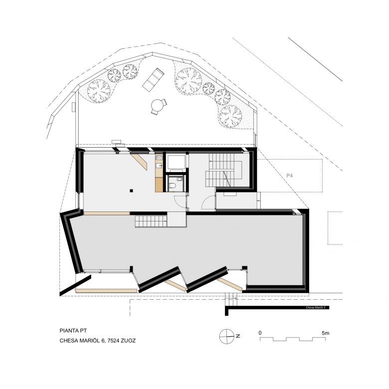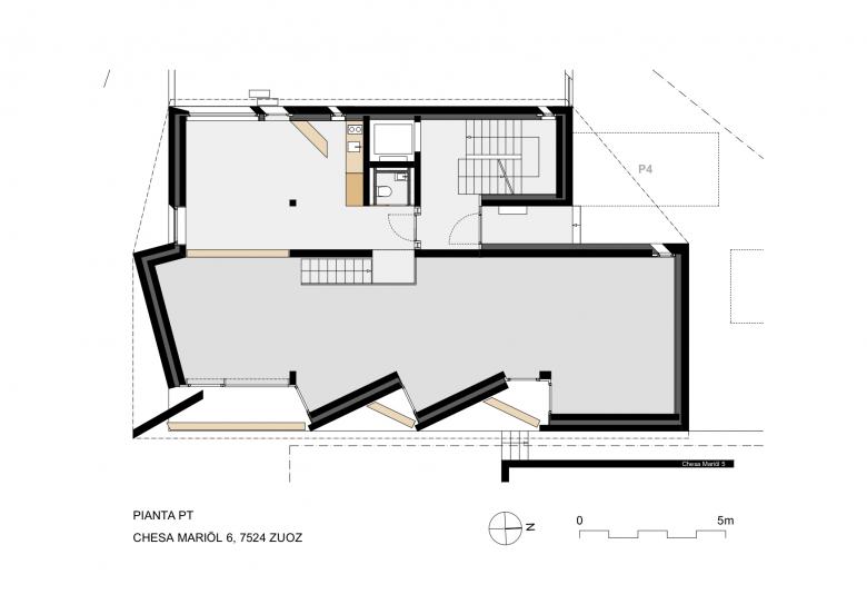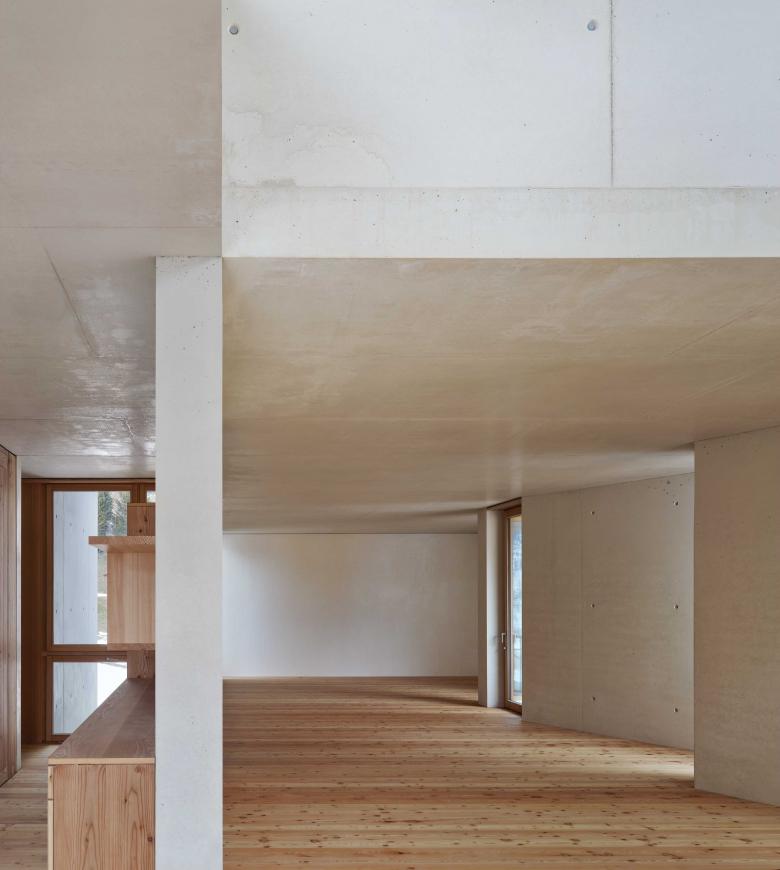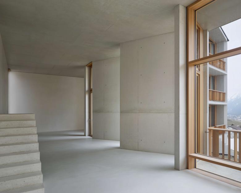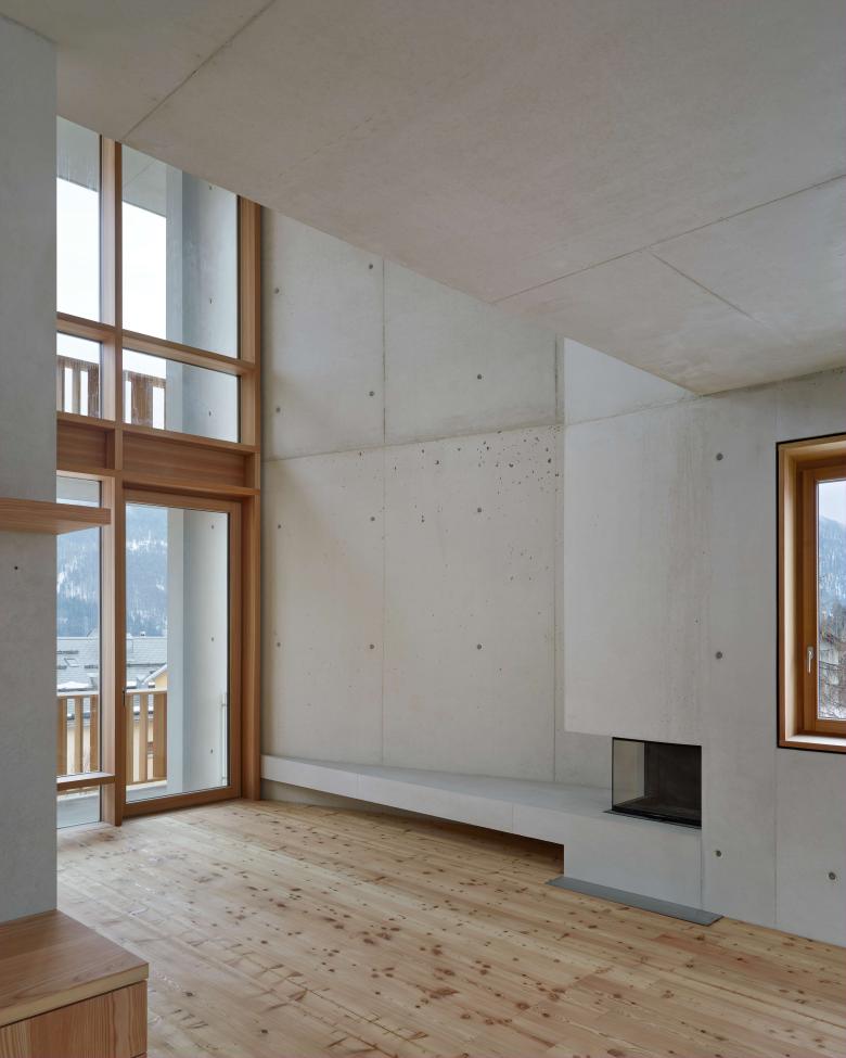 Un grande spazio traversante costituisce l‘elemento caratterizzante la tipologia abitativa e richiama il „suler“ tipico della casa engadinese tradizionale. Le camere si trovano in due corpi di legno più intimi e introversi. La pianta è flessibile e prevede di avere un solo grande appartamento su un piano con due zone notte, una padronale e una per gli ospiti, oppure due appartamenti per piano.