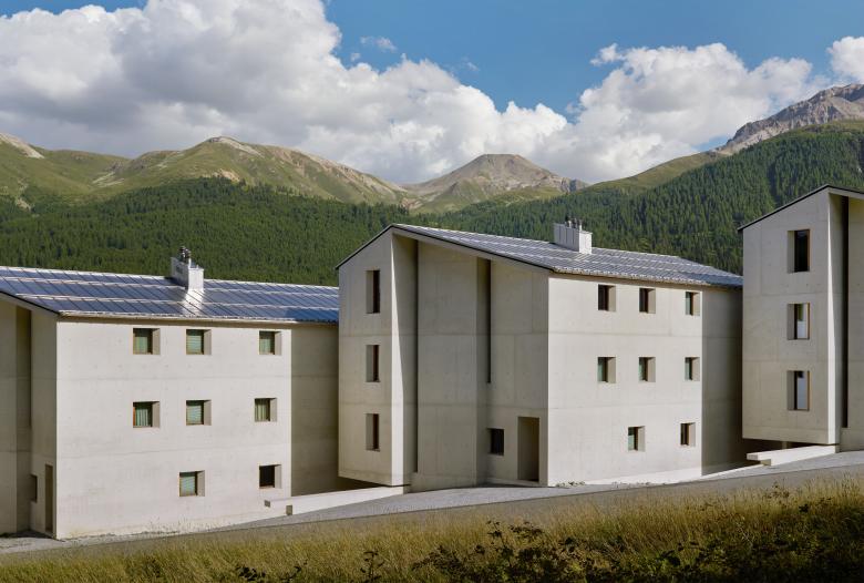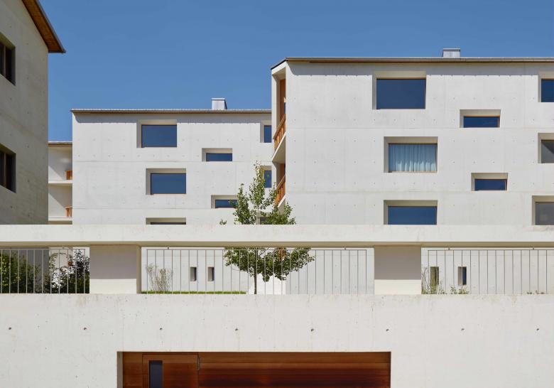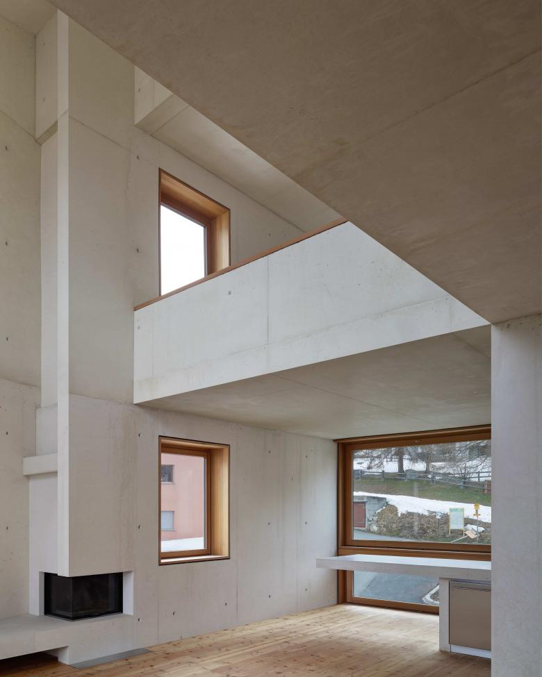 Le facciate rispecchiano la pianta: grandi finestre panoramiche in corrispondenza al soggiorno e finestre più piccole in corrispondenza alle camere. Gli edifici presentano una marcante conformazione plastica, conferitagli dallo spessore delle aperture e dal forte carattere murario del volume bianco. L‘edificio tematizza in parte elementi del luogo, soddisfa però anche le moderne esigenze in termini di luce, vista e spazio. Le facciate e i muri interni del soggiorno sono di cemento bianco, materia che riesce a riprendere la plasticità delle straordinarie case vecchie del nucleo.