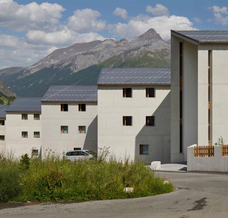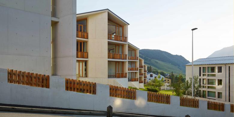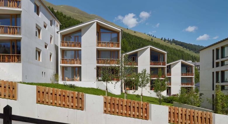 La „Chesa Mariöl“ 1, la prima di una serie di sei case d’appartamenti previste dal piano di quartiere è annessa al nucleo del villaggio ed è dunque la più importante per la sua posizione rispetto alla sequenza di piazze. L‘edificio non si orienta verso il sole, ma lungo l‘asse est-ovest, godendo in tal modo gode di una bellissima vista sul Piz d’Esan a est e sul Piz Mezzaun a sudest. Le Chesas Mariöl 2 – 6 si accostano alla via Mariöl e godono dell’esposizione a sud e del parco – giardino comune. La posizione a gradino permette un’indipendenza nonostante la vicinanza delle case.