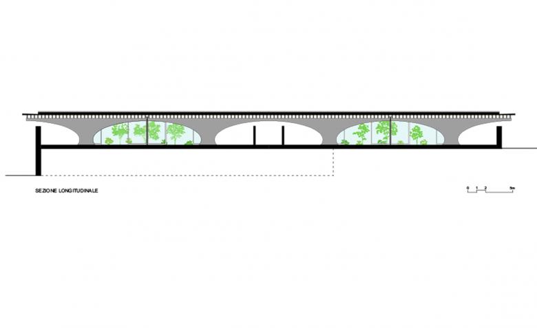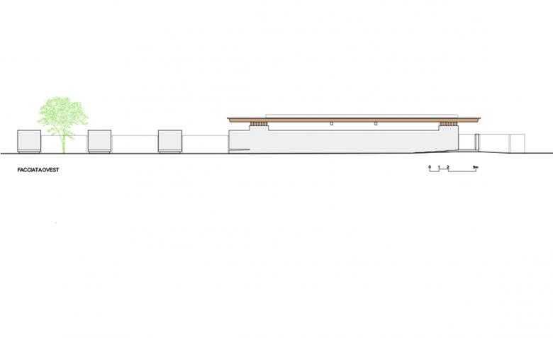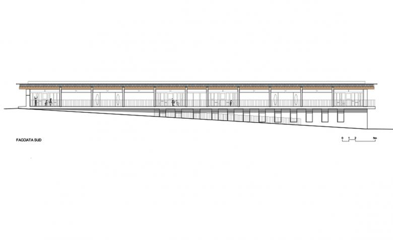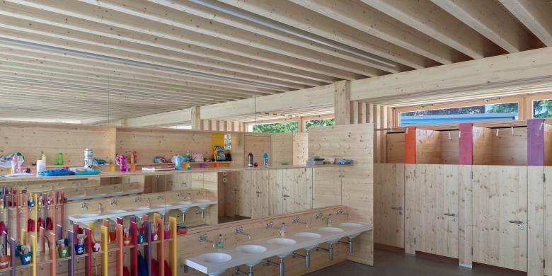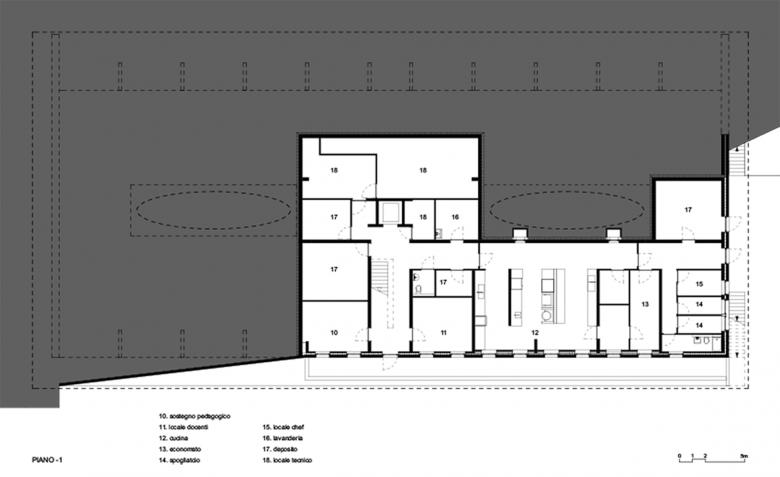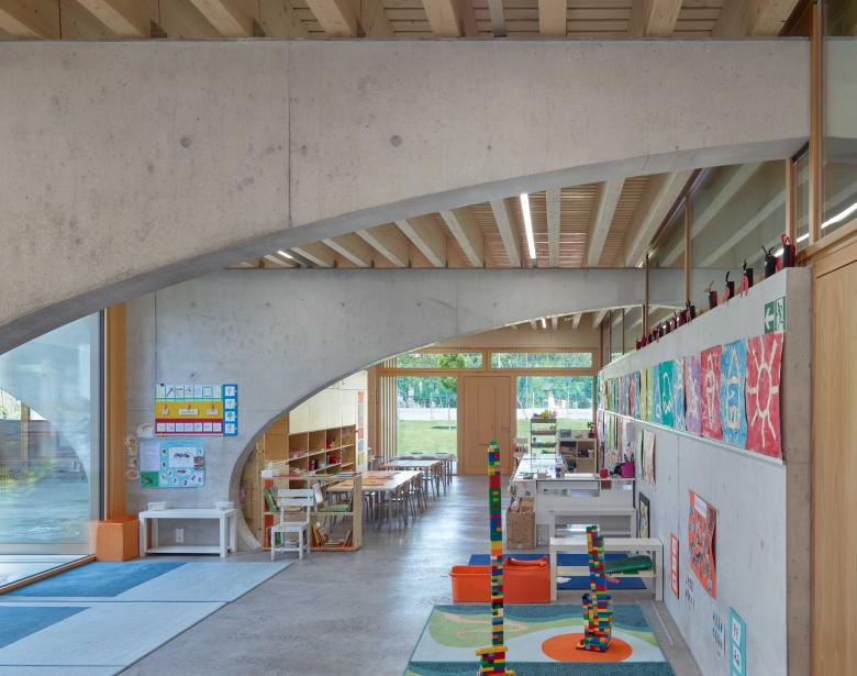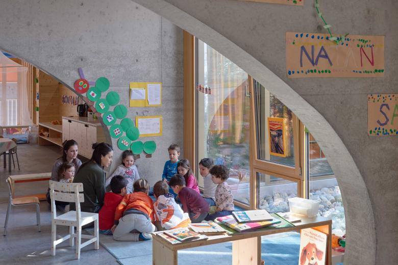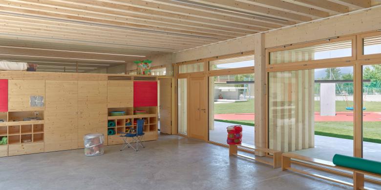 L’edificio definisce con un grande tetto, una lastra orizzontale, il limite sud di un terrapieno rettangolare, posizionandosi tra la scuola elementare, un’area boschiva con biotopo e la scuola media, in modo di mantenere libera la parte nord, quale spazio di riferimento. Le 4 sezioni sono disposte su un piano unico, suddivise in due comparti di due sezioni. Al centro dei comparti si trova un patio vetrato: un’apertura ellittica verso il cielo, un giardino, quale elemento di divisorio e di riferimento, attorno al quale si svolgono le varie attività. Gli spazi di supporto sono collocati al piano inferiore. Il sistema costruttivo è composto da un basamento in cemento armato e da una grande copertura in legno, composta da una serie di travetti, appoggiati sui 4 assi strutturali longitudinali. Essi sono composti da due muri arcati in cemento armato centrali e travi composte in legno laterali che formano delle nicchie verso i ballatoi.