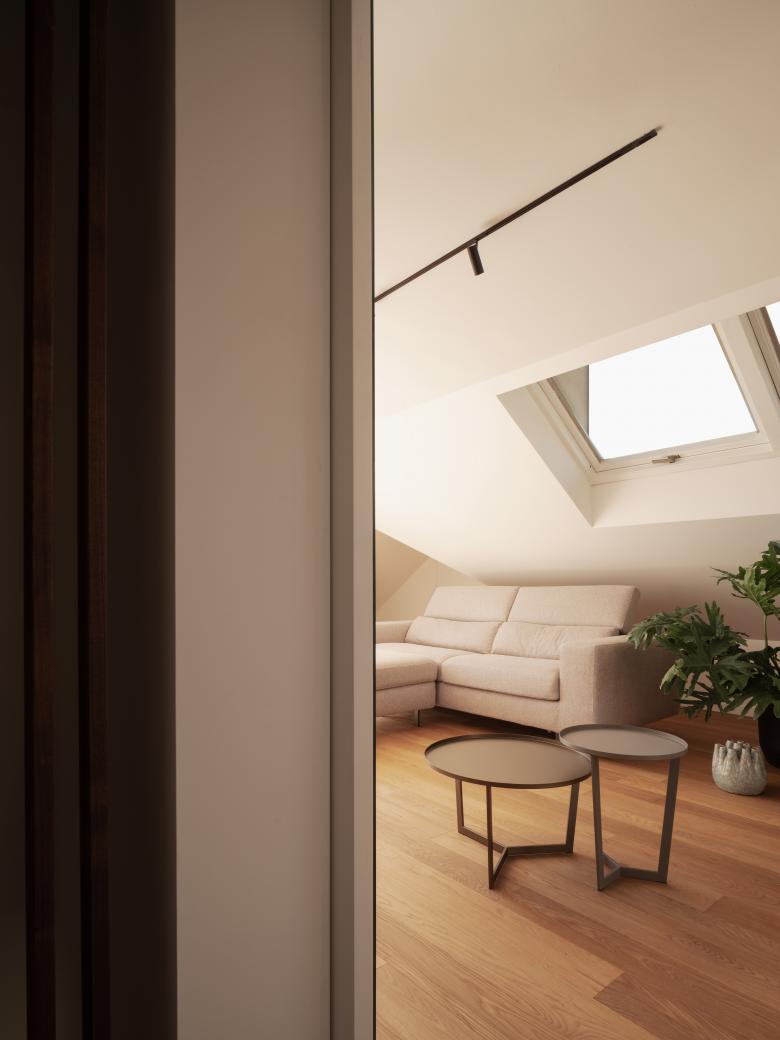 La scala a pianta quadrata, elemento di raccordo con gli altri livelli, è stata completamente ripensata, l’illuminazione viene integrata attraverso un sistema di binari inseriti nel setto centrale e portante, il parapetto viene ridisegnato e vengono aggiunte inoltre, delle pannellature in listelli di legno, che fungono da protezione e filtro visivo. Al piano inferiore, viene alloggiata la zona notte che comprende, la camera padronale con bagno en suite, una seconda camera con cabina armadi e una camera ospiti con bagno. Gli arredi sono tutti principalmente custom, nel corridoio in particolare, vengono disegnate delle porte filo muro alte 2,50 m in noce canaletto e legno listellato.