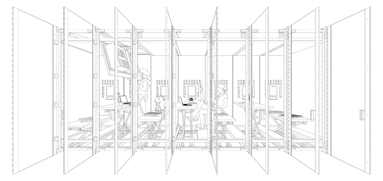 金属结构在外,木围护在内的,外界面采用玻璃,透明开敞。剖面形成C形的空间形态,具有完整的、温暖的内部空间品质。材料元素之间的关系清晰,对于预制、安装、搬运都很便利,具备不错的产品特质。