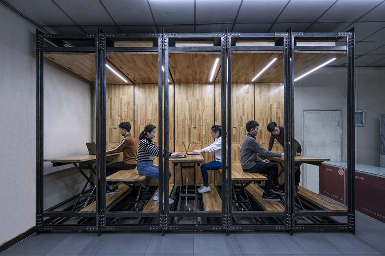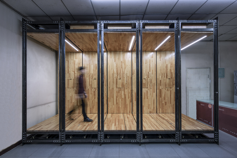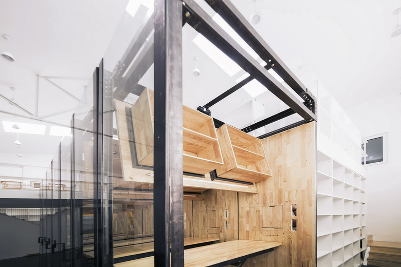 将这个理念延用到办公空间,是偶然也是必然。客户是图文印刷业的经营者,越来越数字化使得实物纸张印量锐减,有意在现有办公空间内分割小区域拓展设计部门,将单一的“印刷”往“印刷+设计”转变。新空间要精小,要区别现有空间,无法判断未来发展状况,要可空间还原。