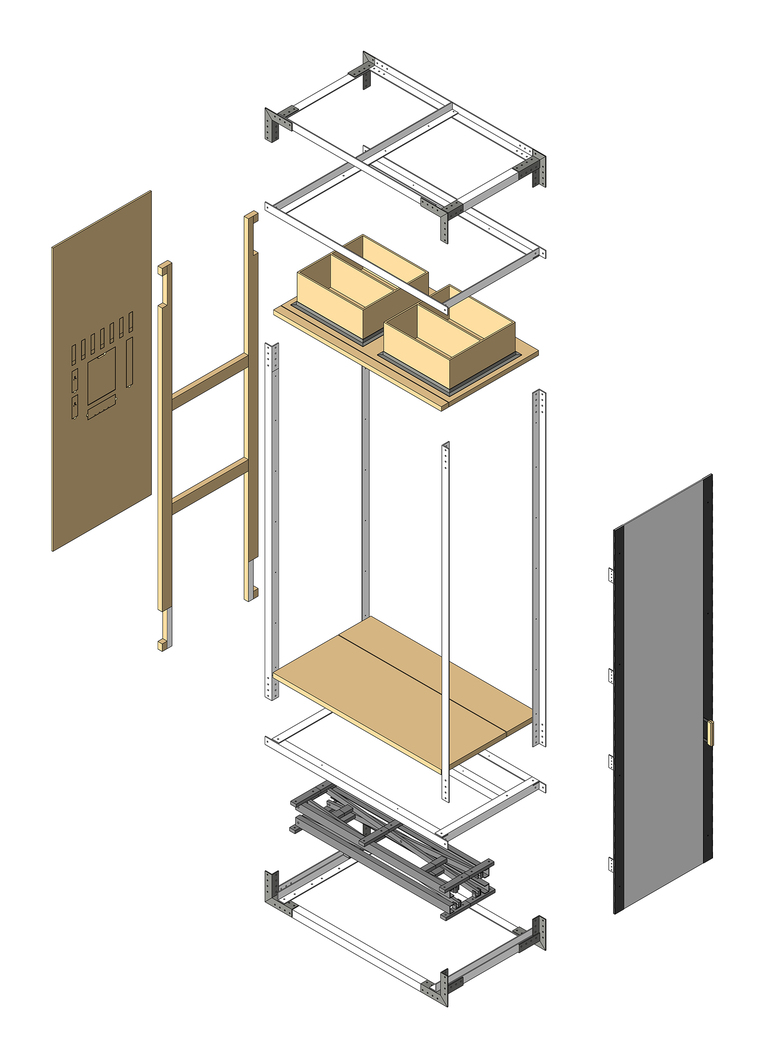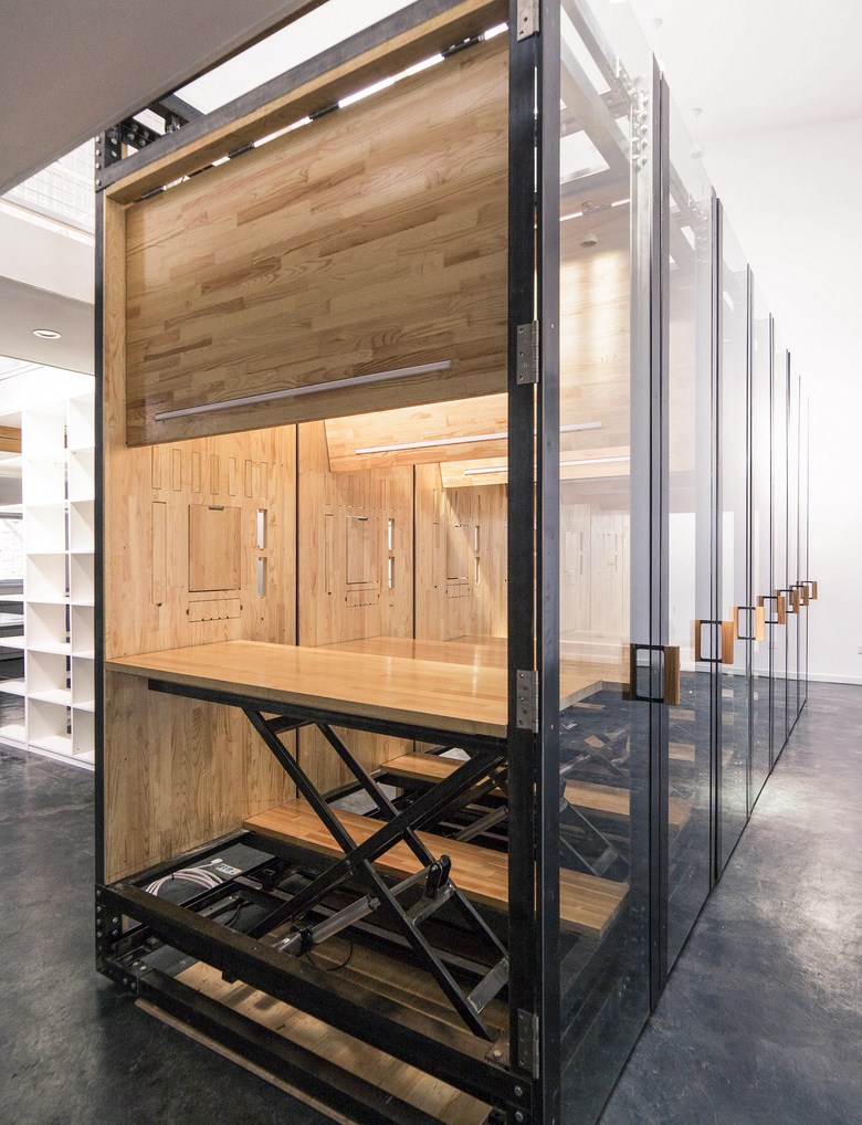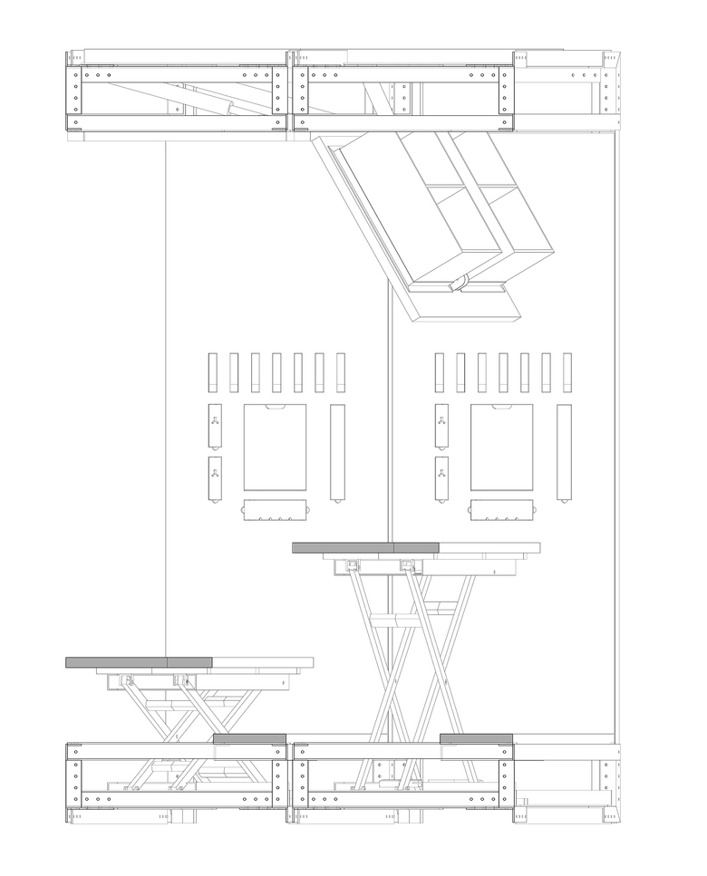 尽可能在单一空间内进行多重功能的空间可转化,让有限的空间得到无限的使用可能:办公、会议、讲演、展示..。可变的构造技术采用“X”变形原理和液压杆的结合,下部桌面、坐面可完全升起、收平,极限可升高1.2m,平可为地、低可为坐、高可为桌,上部柜体可伸缩开合,可收纳办公用品。模块与模块之间可无缝连接,前后平台升降配合,可以进行“桌”、“凳”的转换,高低有序排列可变成小型阶梯会议。