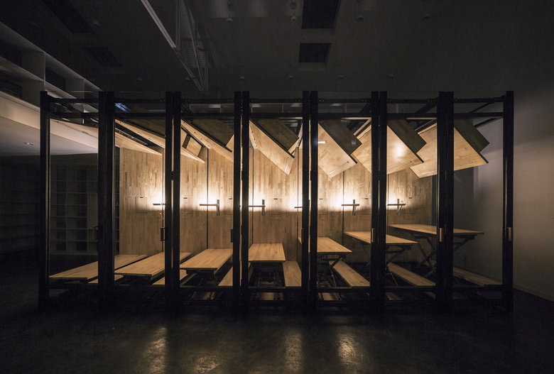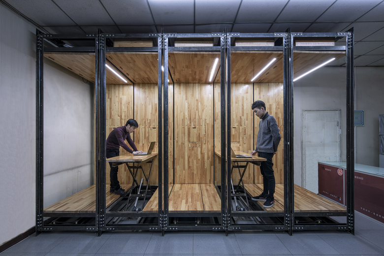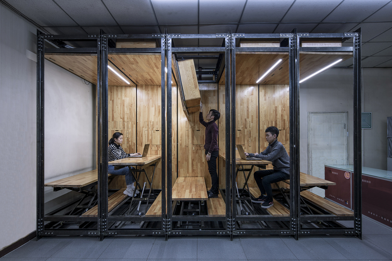 9.639平米,这是比一间普通卧室还小的面积数。它也可以是:12个工位的办公桌台,18人的会议室,28人观看的小型展厅;集成了办公、会议、交流、展示、电路、灯光、储物需求。同时也可是一个微型展览空间,一个阶梯沙龙交流空间;它是一个小建筑、一个大家具、一个大电器。