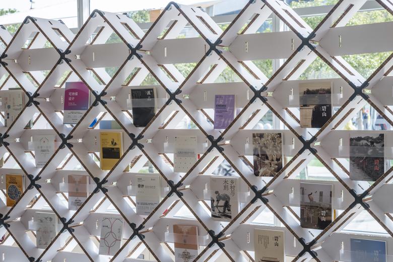 However, the highly industrialized production method is obviously contrary to the humanistic attributes of books. To strike a balance, Yukou Paper, which is handmade by a very unique ancient papermaking method, was chosen for printing the graphic design deliverables such as the exhibition preface, posters, and bookstore logos, instead of using regular paper produced in an industrial way. This kind of paper is slightly yellow and roughly textured, that matches well with the corrugated cardboards on its background, bring the impression of handcraft and correspond to the humanistic attributes of books. The curator Zuo Jing has been promoting this ancient handmade papermaking technique by using Yukou Paper in his daily work.