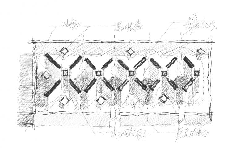 The existing space is rectangular, which is about 40m long, 16.5m wide and 6m high, with a row of concrete columns in the middle. The columns, that have a very strong presence, are 40cm-wide each, and the distance between them is 7.4 meters. A large number of traces of wrapping, hanging, drilling, and demolition have been left on the surface of these columns, which indicates that many exhibition activities previously held here have taken rapid construction and demolition, causing irreversible damage. A lot of metal connecting components for anchoring are reserved on the columns, which seems to default to an exhibition construction method that has to wrap and hide these columns.