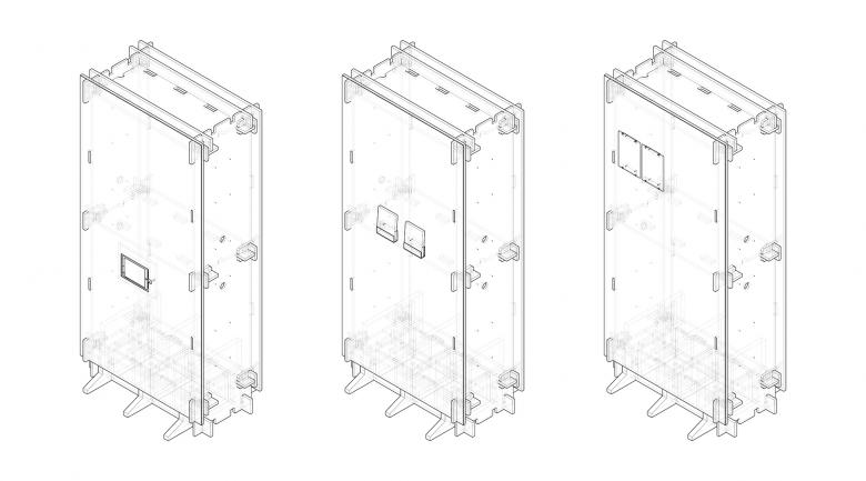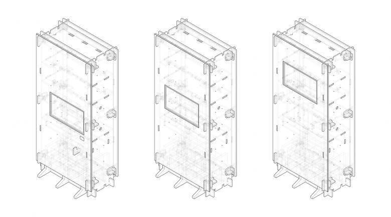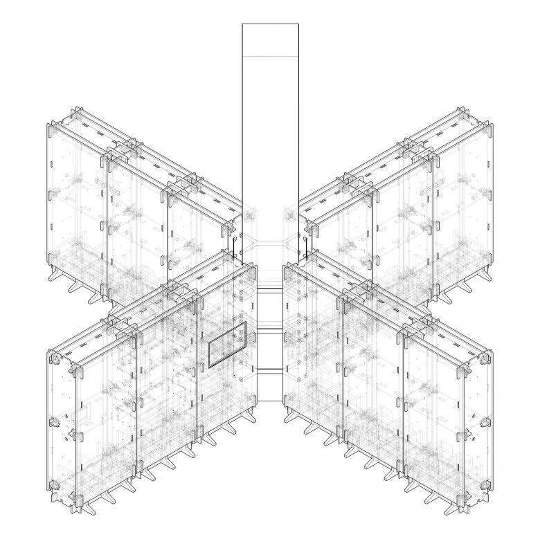 With corrugated cardboards as structural components, CNC cutting technique was used to make concave and convex edges, through which a structure of "mortise and tenon" is created, to form insert buckles of the cardboards. Taking firmness into consideration, boards with two different thickness (15mm and 20mm) have been selected, with a standard size of 1.2m long and 2.4m wide. The smallest modular unit for the cardboard wall is 1.2m wide by 2.4m high, with a thickness of 0.6m. Beside the six pieces of cardboard installed at top and bottom, left and right, and front and back, a fixed connection plate is also added in the 2.4m-high middle section, in order to ensure the structural stability. With a wide of 1.2m, each modular wall unit has slots on the upper and lower sides for horizontal connection. Therefore, a quarter of the "X-wall" can be made by three 1.2m-wide modular cardboards.
