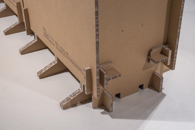 Due to the low density of cardboard, it takes a shorter time for CNC cutting and processing, compared with other conventional building materials. All the 320 pieces of raw cardboards used for the exhibition were processed into 2,566 cardboard components in less than two days. Finally, 42 vertical exhibition modules with a size of 1.2m*2.4m*0.6m and 22 stand exhibition modules were assembled within only two days by six or seven people on site. Such an efficient construction process benefits from not only the lightness of cardboard material, but also the non-necessity of using any assembly tools. Moreover, ordinary people can also take over the work of the professional constructors to assemble the cardboards with bare hands. It also provides great convenience for the following activities of material recycle and reuse.