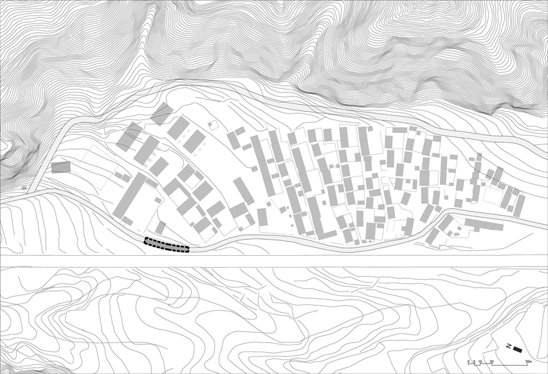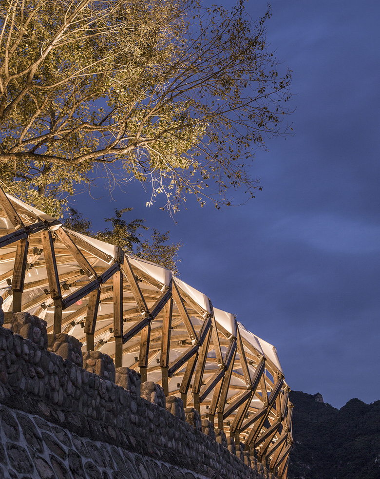 遵从木料的长度不一,形成和山体大环境的自然契合:废木料收集自拆下的房屋,不同的房屋进深搭建的时候木料也长短不一,顺应这些不同的长度,建造的同时考虑木料的长度变化容差,通过搭建的位置编排控制,得到一个变化的空间形体,既是对木料的顺应,也是对山体大环境的顺应。