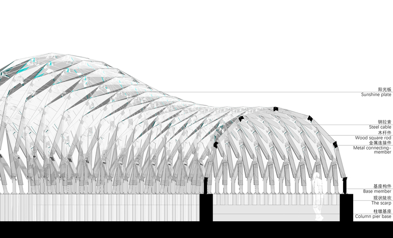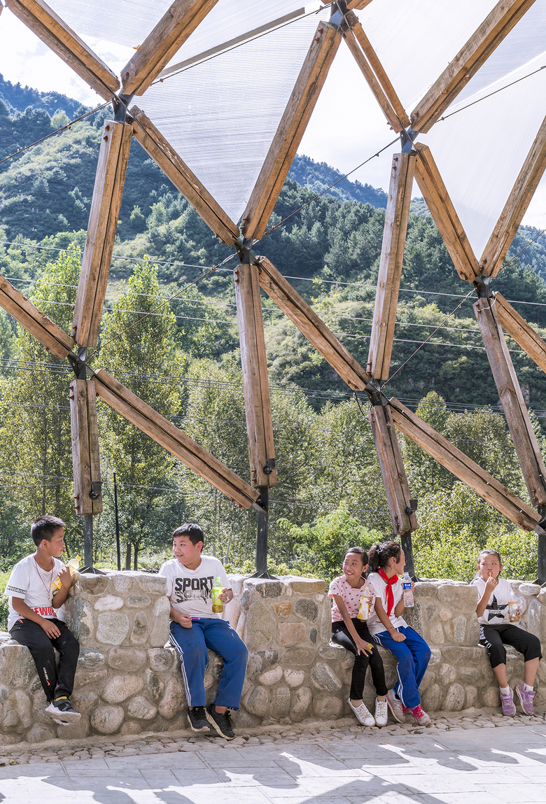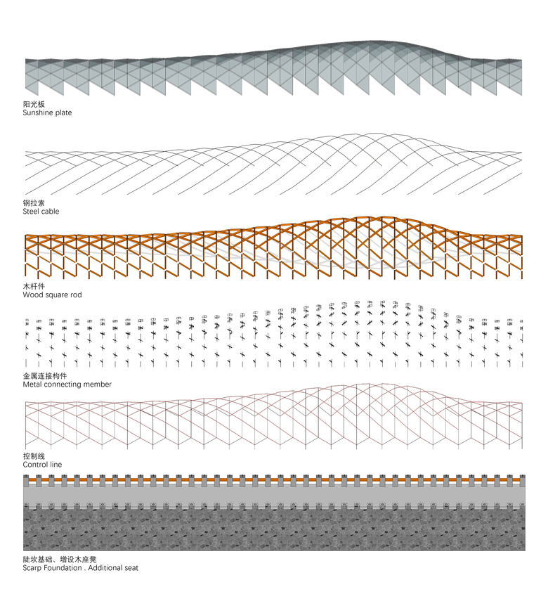 如果能够将建造单元材料尽量拆分小,这样就可以获得更多闲弃木料的再利用可能,可以组织村民靠普通人力就建设完成;单元杆件形成结构体系,可以得到更好的稳定性和一个更大的空间;网络化结构在日久累月的使用中,假如出现自然力破坏,也会得到更大的安全系数。通过这种建造手段,实现了更少的资金投入、更便捷的人力建造。