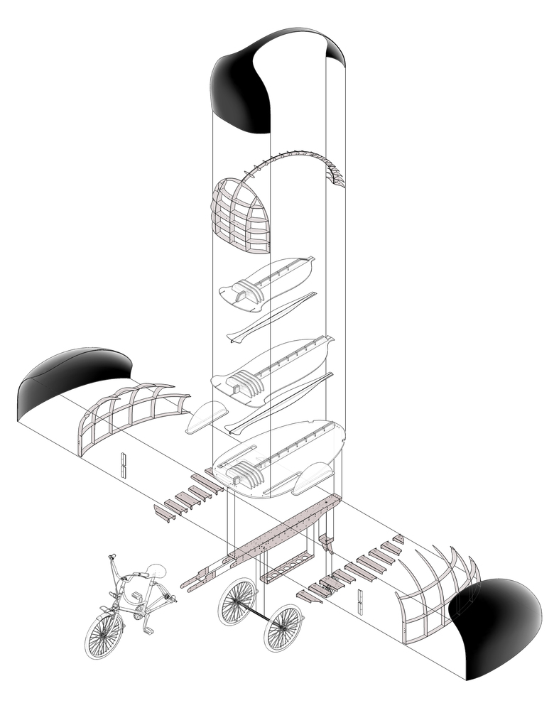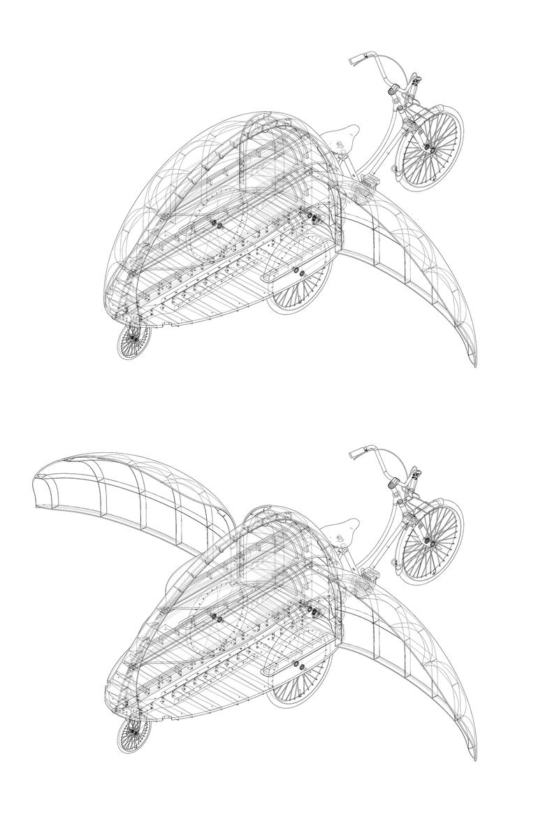 要陈放多一些的物品,将共享单车改造成承载量大的三轮车架。避免来回搬运物品和安全性,要对储物架进行遮盖。一个有意思的遮盖、一种更具创意的打开方式被充分想象,七星瓢虫是小朋友们相对比较了解的有益甲虫,选择将瓢虫翅翼打开的方式,运用到三轮货架的遮盖开合理念上。这种开合状态使得货架相对较长,为了综合稳定性,在整车尾部增加了一个万向的辅助轮。根据封闭的内空间合理设置陈放层台,多层的设计方便储物也增强了整车结构,结合上层小下层大的特点,首层板宽度大设置了可以坐靠的空间。