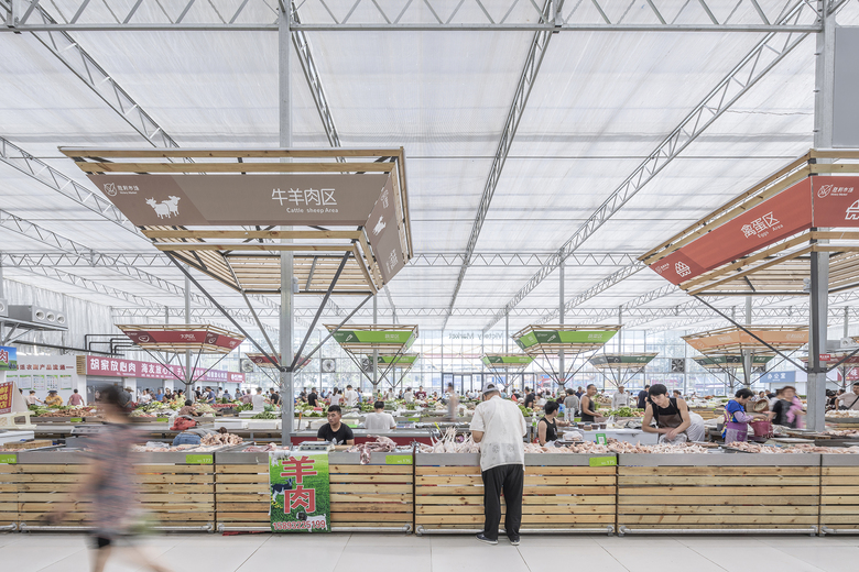 标准的工业大棚空间,是均质而无序的。常规菜市场的问题就是辨识混乱,如何通过必要的增建,在无序的空间里营造出秩序,方便贩卖管理和市民采购,是设计的第二个议题。增建添加必须满足两个条件:尊重和利用现有结构和构造杆件的模数、新增建造是非标准构件(再用性弱)必须低造价。