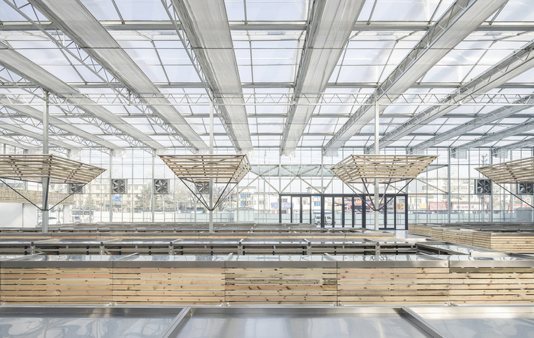 临时市场,甲方的诉求:建造足够快速,造价尽量低廉。作为设计师,则希望兼顾建造的可持续性,临时使用期满,依然可以进行功能的转换和再回收利用。一种低造价、快速的、空间满足多重使用的建造状态在设计推导中被叠加考量,“方形”平面也是前置条件之一。充分工业化、超级标准套件的蔬菜大棚方式第一时间被纳入实施优选方案。它的建造部件是模块化、轻量化、装配性的,可快速建造,通过低成本而获得相对大空间,还可拆除异地建设,杆件是标准件可以回收再用。