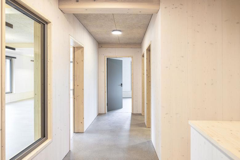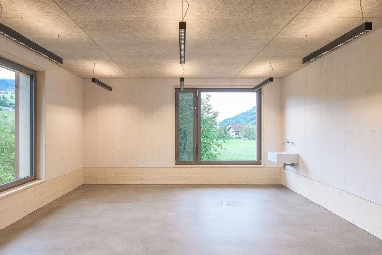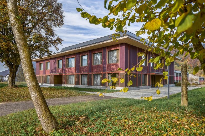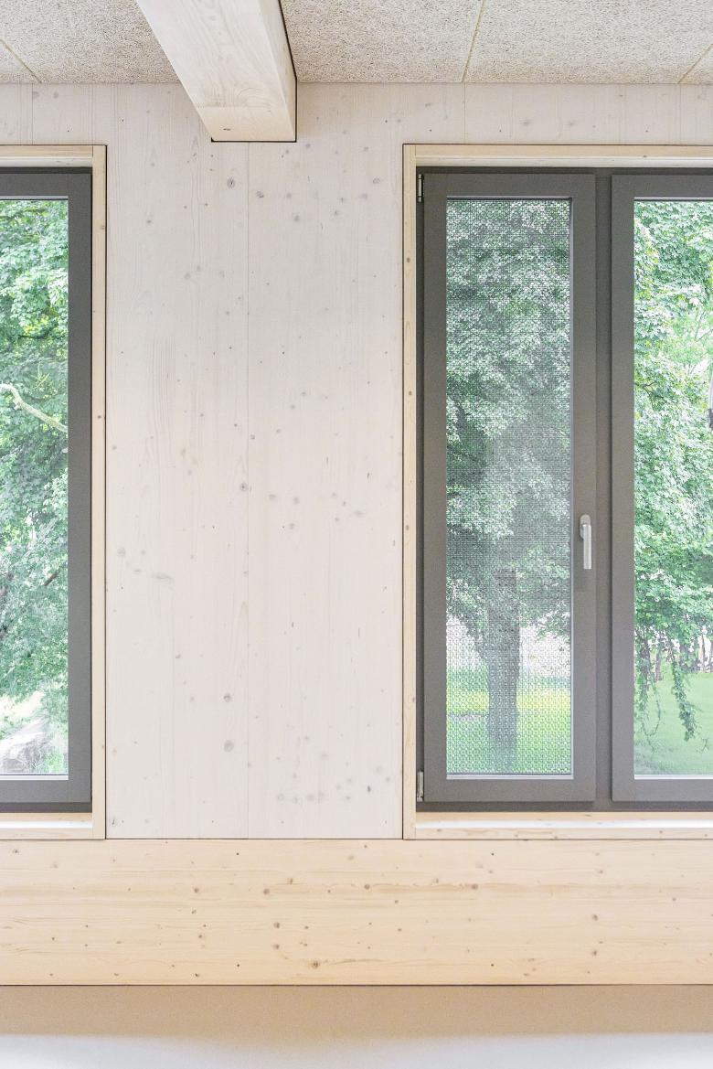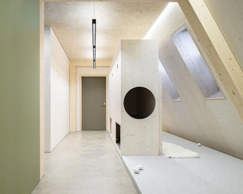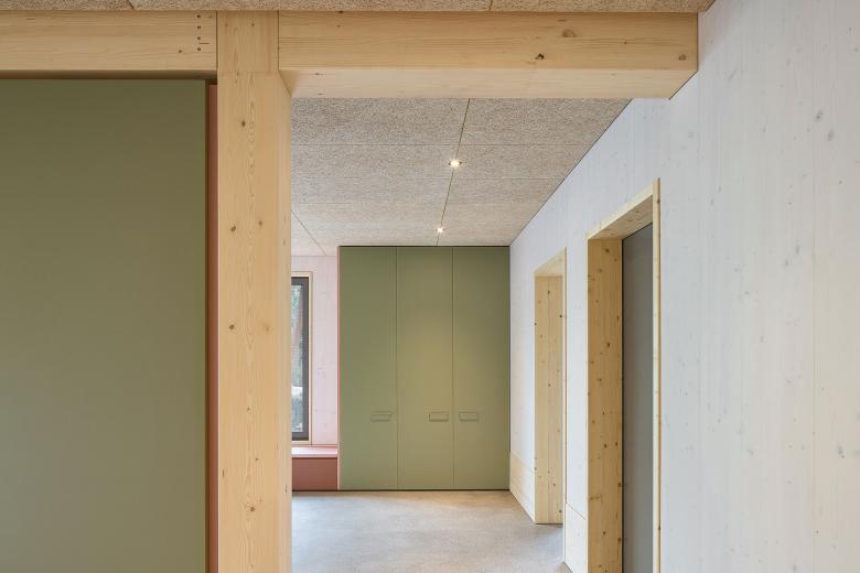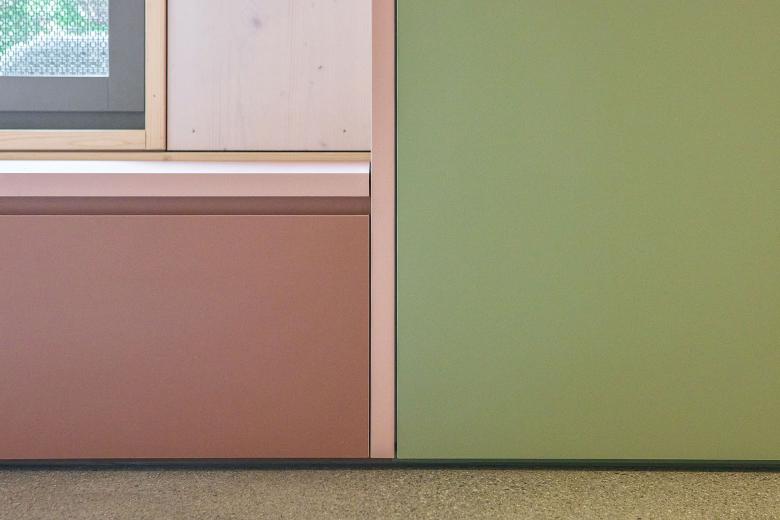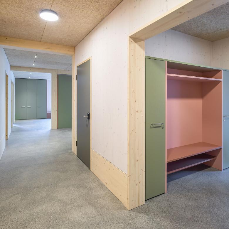 Neben der Einbeziehung und Aufwertung der umgebenden Natur sowie der Schaffung qualitativer Aussenräume hat die Materialisierung einen positiven Effekt auf seine Nutzenden. Die naturnahen Materialien und ihre harmonische Farbgebung wirken sich begünstigend auf das Befinden der Kinder aus.