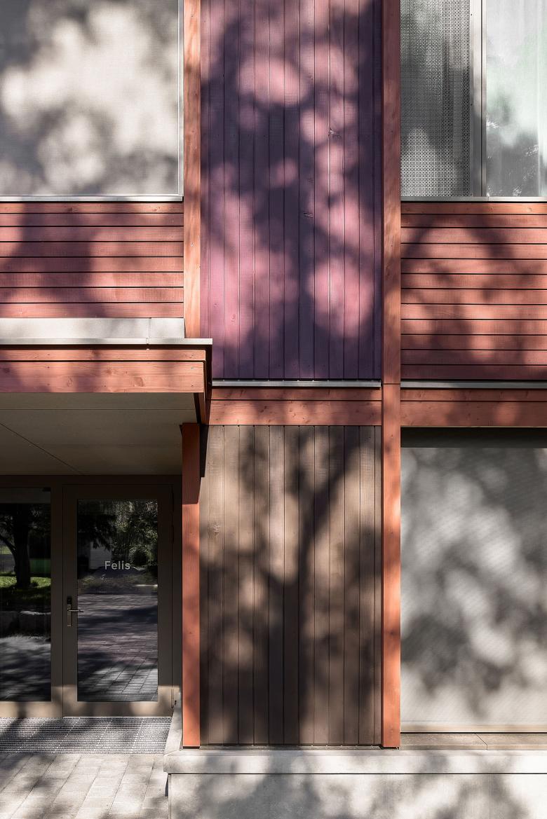 Der Schulneubau greift das Farbkonzept der Bestandsgebäude auf, fügt sich so ein und rundet die Anlage harmonisch ab. Die einzelnen Fassadenabschnitte werden über liegende und stehende Schalungen strukturiert. Vertikale Holzlisenen bringen zusätzliche Gliederung. Gestalterisch abgerundet wird der Bau vom prägnanten zweigeteilten Dach, welches das dritte Geschoss beinhaltet. Das Gebäude erhält den Ausdruck eines Zweigeschossers und einen spielerischen Abschluss nach oben.