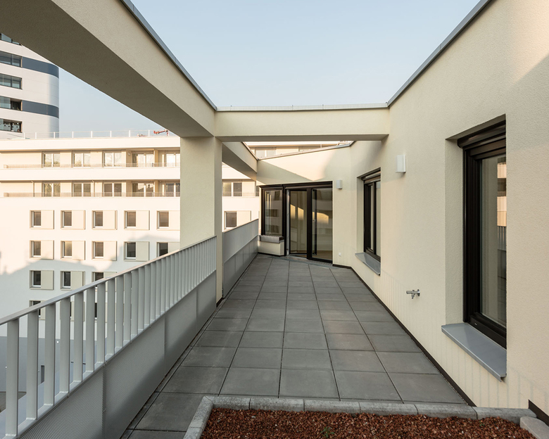 Schön für die BewohnerInnen ist trotz der urbanen Situation die ruhige Innenhoflage. Durch die viel höheren umliegenden Gebäude war es wichtig, ihnen mit Loggien und sichtgeschützten Dachterrassen Privatheit in dem exponierten Umfeld zu geben. Die Wohngeschoße sind durch eine aufgeständerte Erdgeschoßzone angehoben. Es gibt keine Eigengärten, sondern einen großzügigen Innenhof, der für alle zugänglich ist. Da wir einen kompakten Baukörper schaffen wollten, die Widmung aber nur ein schmales und langes Gebäude zugelassen hätte, war ein §69-Verfahren zur Abweichung von der Widmung nötig. Der Baukörper konnte so von der Nachbarbebauung abrücken und mit einem natürlich belichteten Mittelgang erschlossen werden. Die Grundrisse sind ökonomisch gestaltet. Ein einziger kompakter Kern konzentriert die Nassgruppen und die Küche um sich. Die neuen Eigentümer sind sehr zufrieden und das Engagement von M&S Architekten wurde auch seitens der Stadt Wien belohnt: Der Wohnbau wurde mit dem Preis “Gebaut 2016” für innovative und vorbildliche Bauten in Wien ausgezeichnet.
