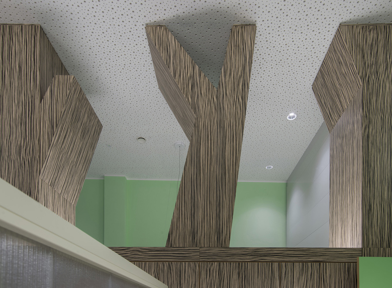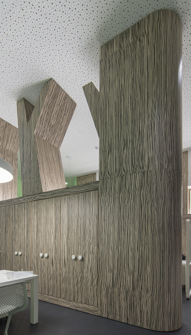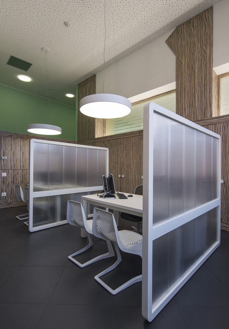 ciascun piano, tali da consentire l’inserimento della filiale bancaria e l’esercizio di tutte le attività ad essa connesse. Al piano terra si trovano i locali aperti al pubblico: il salone con le isole operative, gli uffici, il caveau e i locali di servizio; ai piani superiori sono situati invece gli uffici più riservati, gli ambienti amministrativi e gli spazi riunione.