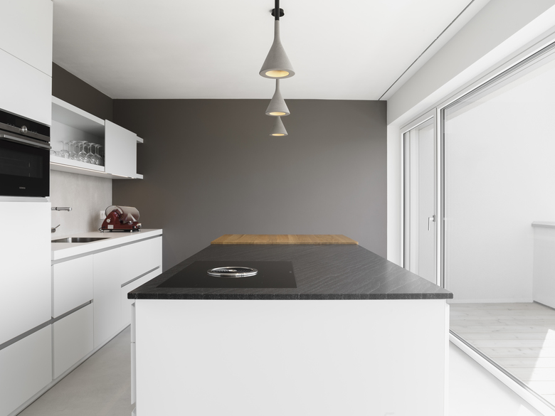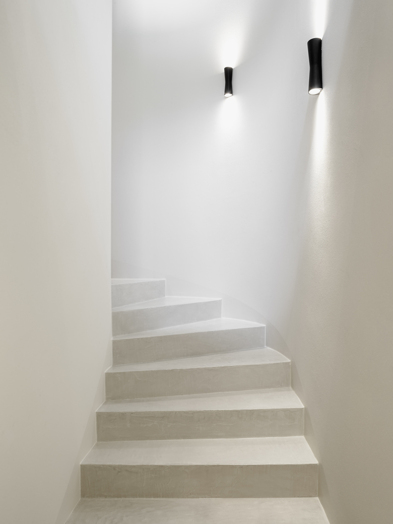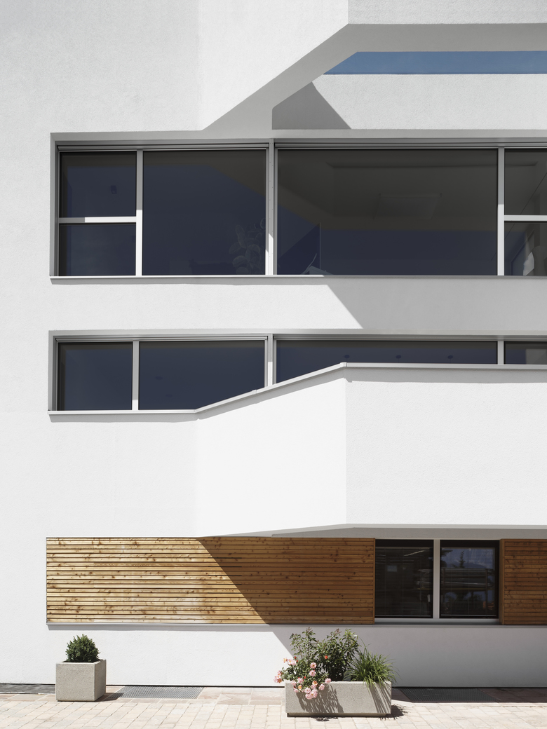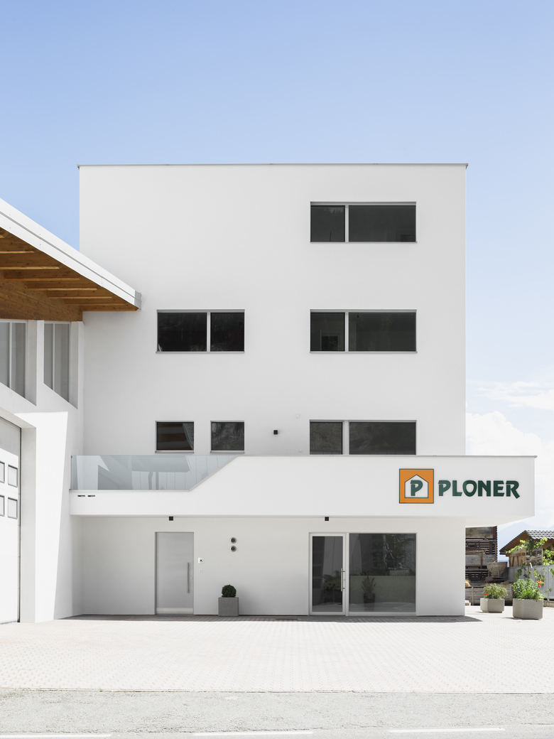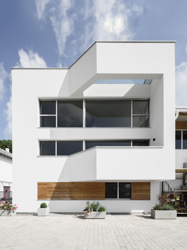 The project consists in the partial demolition and new erection of an existing but never completed house from the mid-nineties on the company's plot. The conversion includes the overhaul of the offices in the ground floor and the construction of an apartment in the first and second floor with a roof-deck. The removal of the gabled roof, the demolition of all partition walls and the modification of the existing apertures made way to redefine a new volume, which would match with the client's agenda. Starting point for the conceptual design was the restructuring of the vertical plot plan. The former perron, which from the forecourt led to the first floor, was replaced by an new interior staircase. The first floor hosts a wardrobe, a kitchen with dining corner, a bathroom, a utility room and a balcony on the south side. The second balcony, which is oriented to the north and west provides a weather shield for the office and apartment entrance on the ground floor. The second floor consists of the living room, the master bedroom, a nursery, a bathroom and a wardrobe. A wooden staircase leads to the roof-deck, which is canopied on its north side to provide shelter for a lounge and a small bar and trends to the south with a largely open view on the surrounding mountains. Two stirrups coin the south-façade, which evolve from the rectangular floor plan, forming a balcony on the first floor, a sunscreen above the living room and a viewing pulpit on the roof deck with a glazed floor panel. The turret-like building blends into the company's ensemble on its north side, is closed on its west side and opens up towards the south side with beautiful views on the dolomites.