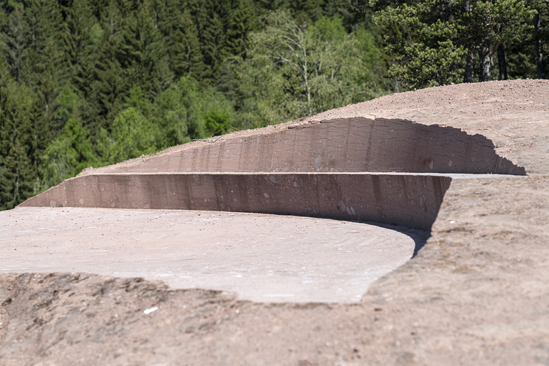 At the Rotstein-Knott – in the immediate vicinity of the„Knottnkino“ – conceptualized and created by the artist Franz Messner in the year 2000 – evolves through circular cuts in the terrain, an even, from the porphyry elaborated space with a bench and a backrest. The circular segments immerge into the landscape and dissolve. The only thing that remains on the surface are traces in the form of lines