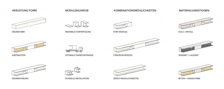 Das gesamte Gebäude ist in einzelne Module zu je 3m Breite gegliedert, die verschiedene Funktionen aufnehmen und beliebig miteinander kombiniert werden können. So kann das Gebäude auf seine Umgebung reagieren und sich gezielt den Anforderungen anpassen. Die vorgeschlagene Modulgröße ermöglicht einen unkomplizierten Transport auf das Grundstück, erlaubt einen maximalen Vorfertigungsgrad mit optimaler Ausbauqualität und zeitsparender, effektiver Montage auf dem geplanten Grundstück.