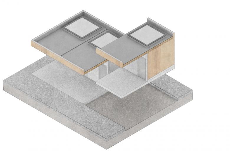 Das Volumen des modularen Gebäudes öffnet sich durch gezielte Aushöhlungen zu beiden Seiten des Parkplatzes. Die Zwischenräume wirken wie aus einem Block herausgeschält, durch den Wechsel der Modulrichtung und die verbindenden Zwischenräume entsteht eine begehbare Skulptur, die das Zentrum der neu entstehenden Rastanlage bildet. Die gedachten Schnittflächen im Inneren des Baukörpers werden materiell oder farblich abgesetzt ausgeführt, um diese Wirkung zu verstärken und einen klaren Wiedererkennungswert zu schaffen.
