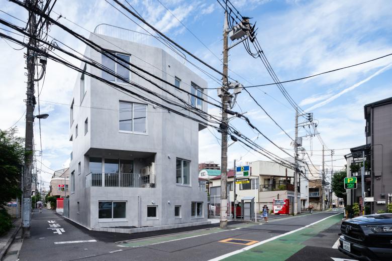 東京郊外の中山道から一本路地を入った先の角地に敷地は位置している。周辺では幅の狭い商店街の街路に沿って兼用住宅が稠密に建て込み、駐車場が空地として点在している。良好な住環境とは言い難い周辺なので、敷地内に住民のための空地的な場所をつくりたいと考え、コンパクトなボリュームにまとめて外部空間を確保する方針と、また設計を始めて間も無くしてコロナ禍となったことも併せて共用部のない長屋を検討することにした。