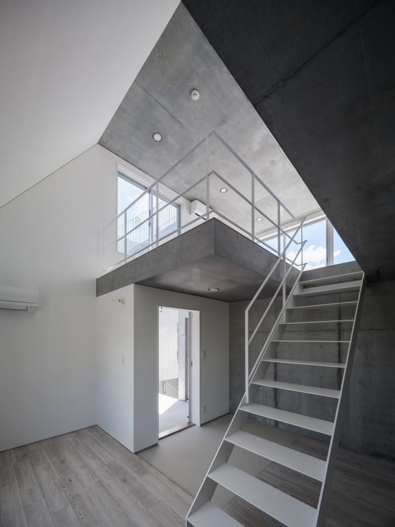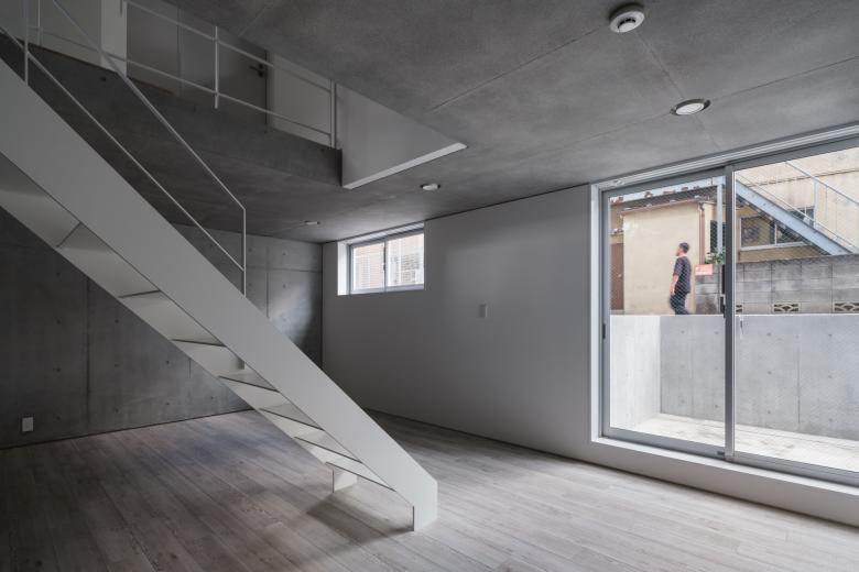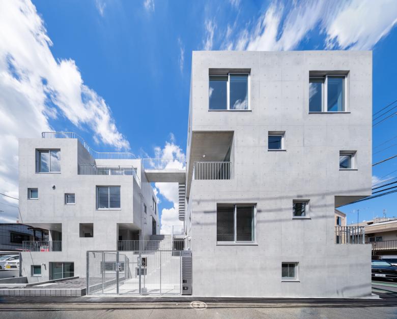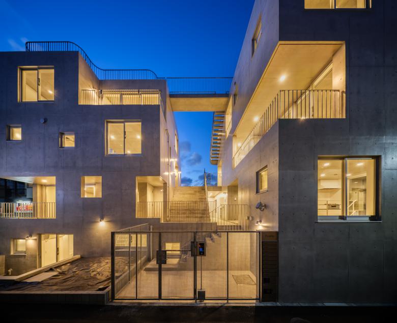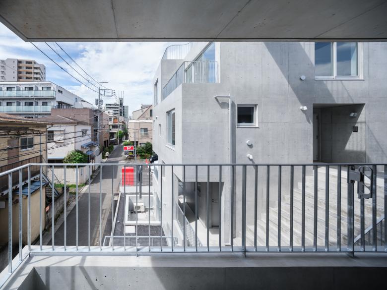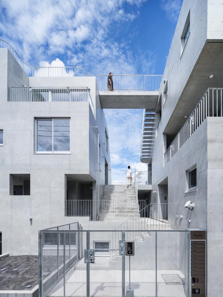 各住戸へのアプローチは上空が開放された階段状の基壇に上るので、一度住人がその場に集まるが、一方でそこからは各住戸へ独立した入口をもつ。コモンとプライベートが重なったような場所である。階段状の基壇は建築化された外部なので、共用部をもたない厳密な意味での長屋の形式とはいえない。