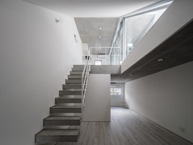 例えば、この建築において上述した基壇のような場をどのように呼べば良いか。空地的であるが、建築化されている。階段の踊り場のようであり、屋上広場にも思える。分棟や長屋といったある種の形式とそれをズラした脱形式を同時に重ねたような建築のあり方による場は、ズラされている訳なので現在において的確な名づけはない。名づけは形式化なので、何ともいい難いその場が制度から解放された建築の萌芽となるのだろう。
