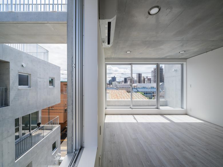 またズラして配置された分棟的な建ち方の2つのボリュームでは、各住戸が多方向に開口をもつ良好な室内環境が得られる。それらは基壇とブリッジによって繋がっているので、周辺に対しては統合された建築としての構えも併せもち、純粋な分棟ともいえない。