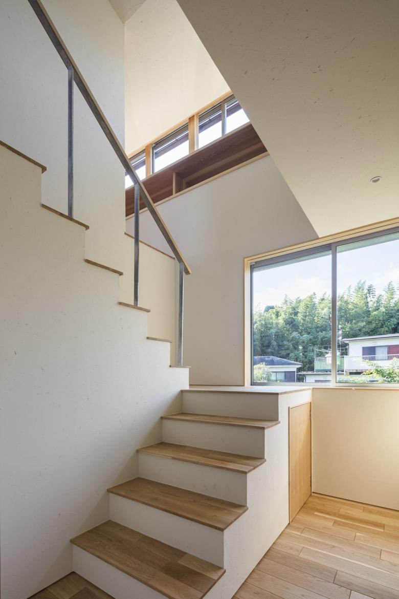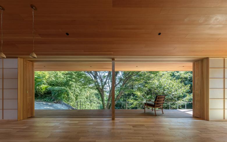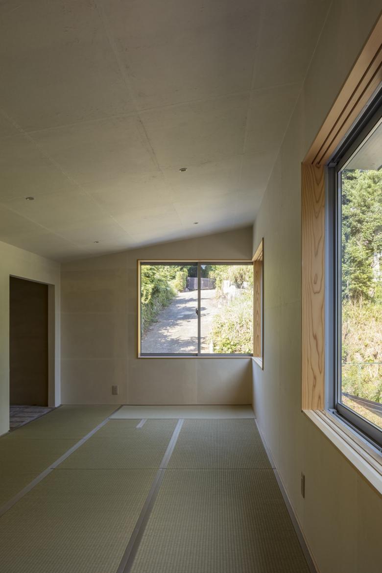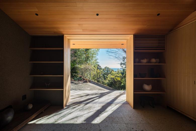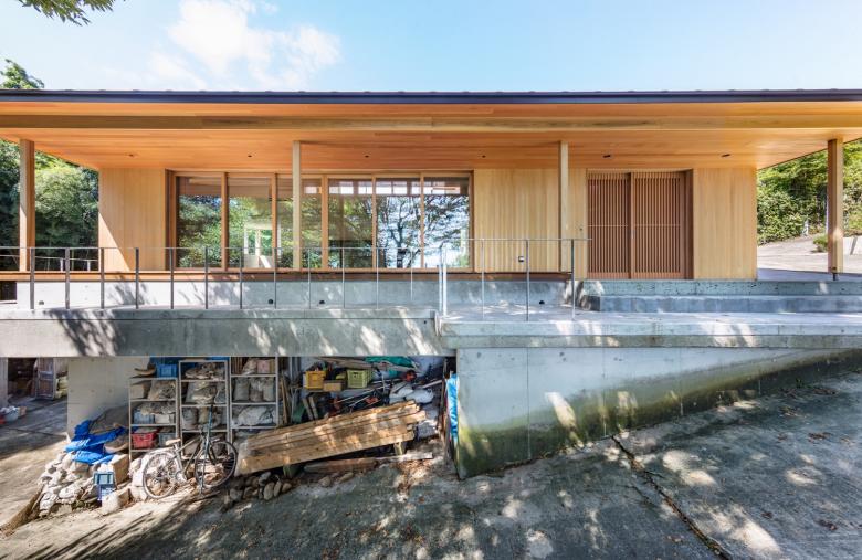 施主の陶芸家夫妻は20年程前に遠くに真鶴湾を望むこの土地に移住してきた。斜面に半分が埋まるRC造の地下とその上に載る木造2階建の中古住宅を購入した。2人の子供たちが家を離れることを機に、アトリエとして利用している地下躯体を残して上屋を建て替えることにした。