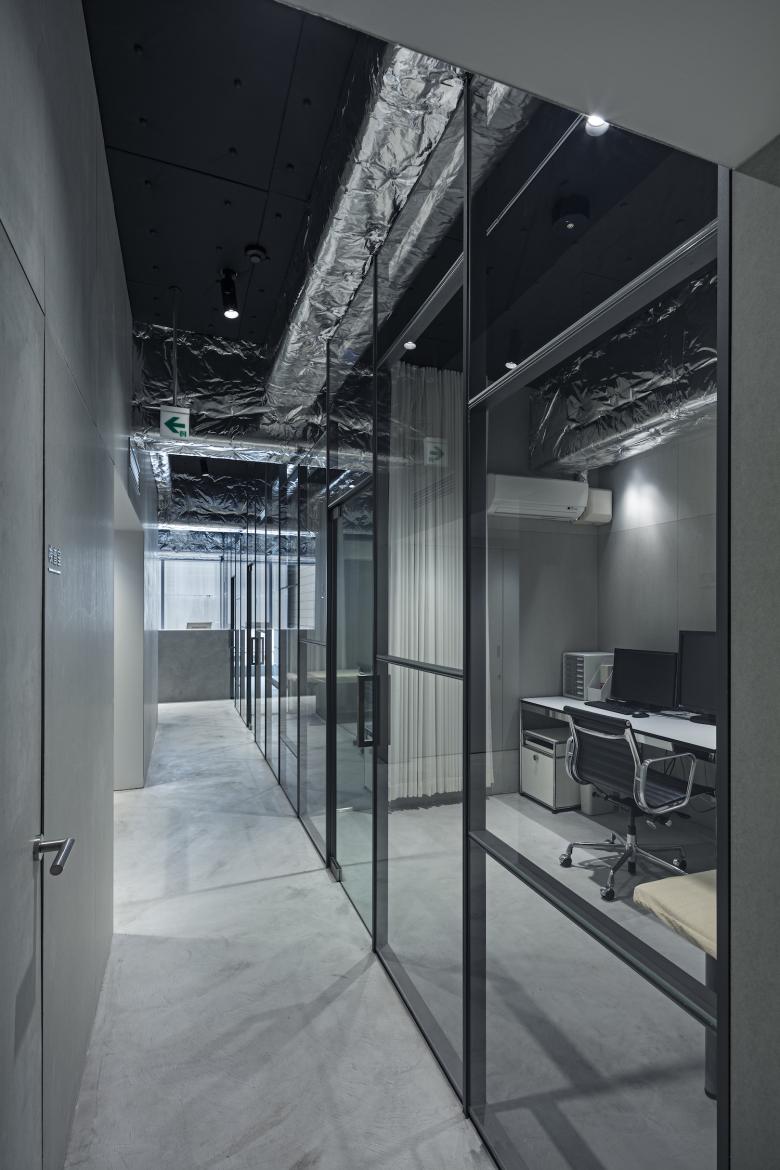 銀座の雑居ビルに入る循環器系・消化器系内科のクリニックの内装である。1フロア100m2強の建物は間口が狭く奥行が深い、いわゆる鰻の寝床である。避難動線を確保しながら必要な諸室を並べてしまえば自動的にプランニングは決定してしまう。10m2に満たない閉鎖的な室が並ぶのはあまりにも不健康な状況である。建物の奥にいても窓の外を感じらるようにしたい。だから梁下に天井を貼らないでなるべく高さを確保して、間仕切りをガラスのスクリーンとしている。